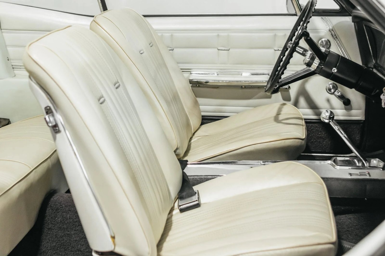The cabin houses front bucket seats, a rear bench, and door panels that are trimmed in white vinyl.