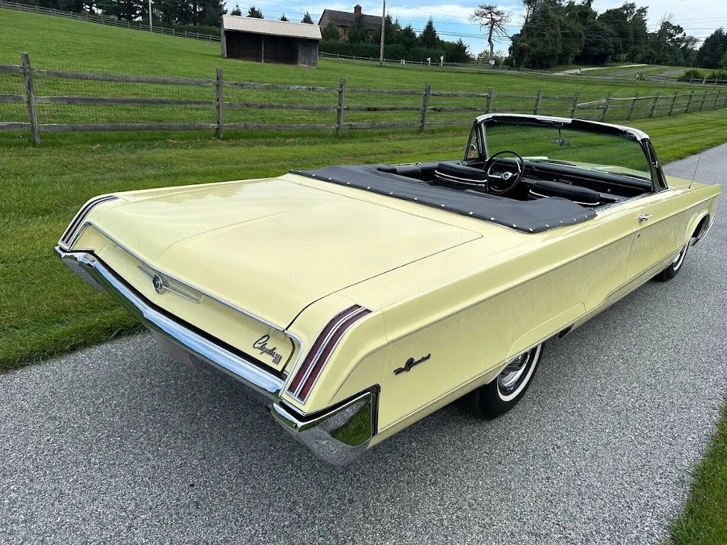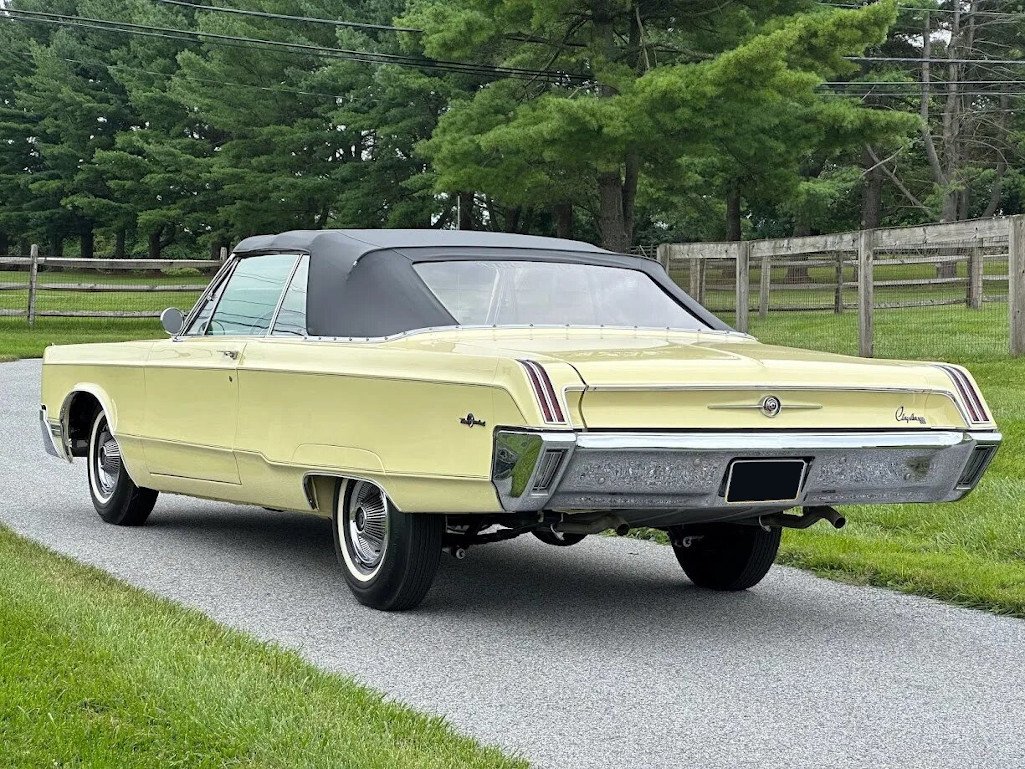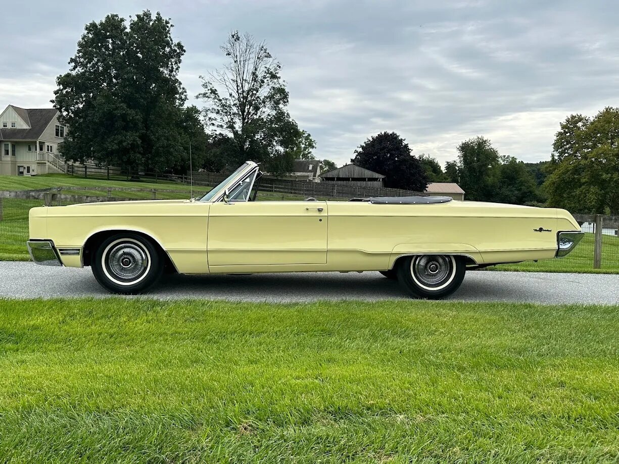 This 1967 Chrysler 300 convertible underwent refurbishment work from 2002 to 2005 that involved refinishing the body in yellow, reupholstering the black vinyl trim, and servicing electrical and mechanical components. Power is supplied by a 440ci V8 paired with a three-speed automatic transmission, and equipment includes wheel covers, whitewall tires, a power-operated retractable black top, chrome bumpers, dual exhaust, air conditioning, power steering, and a Panasonic AM/FM/CD stereo.