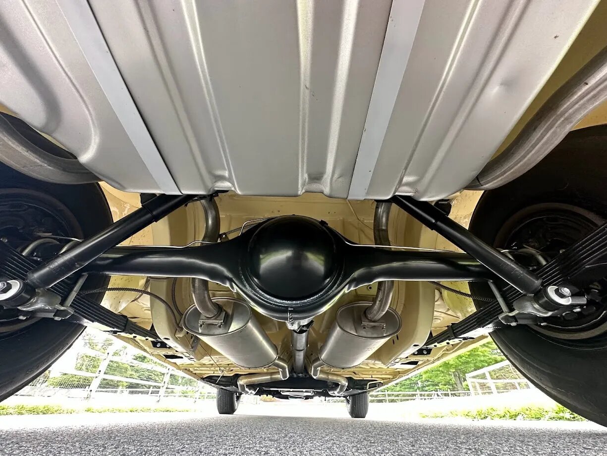 Steel 14″ wheels wear turbine-style covers with 300-branded centers and are mounted with 8.85-14 BFGoodrich Silvertown bias-ply tires. Braking is provided by power-assisted four-wheel drums.