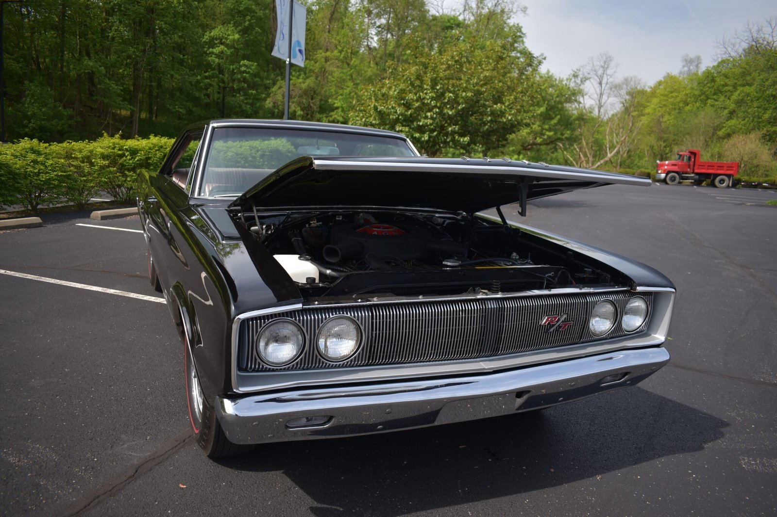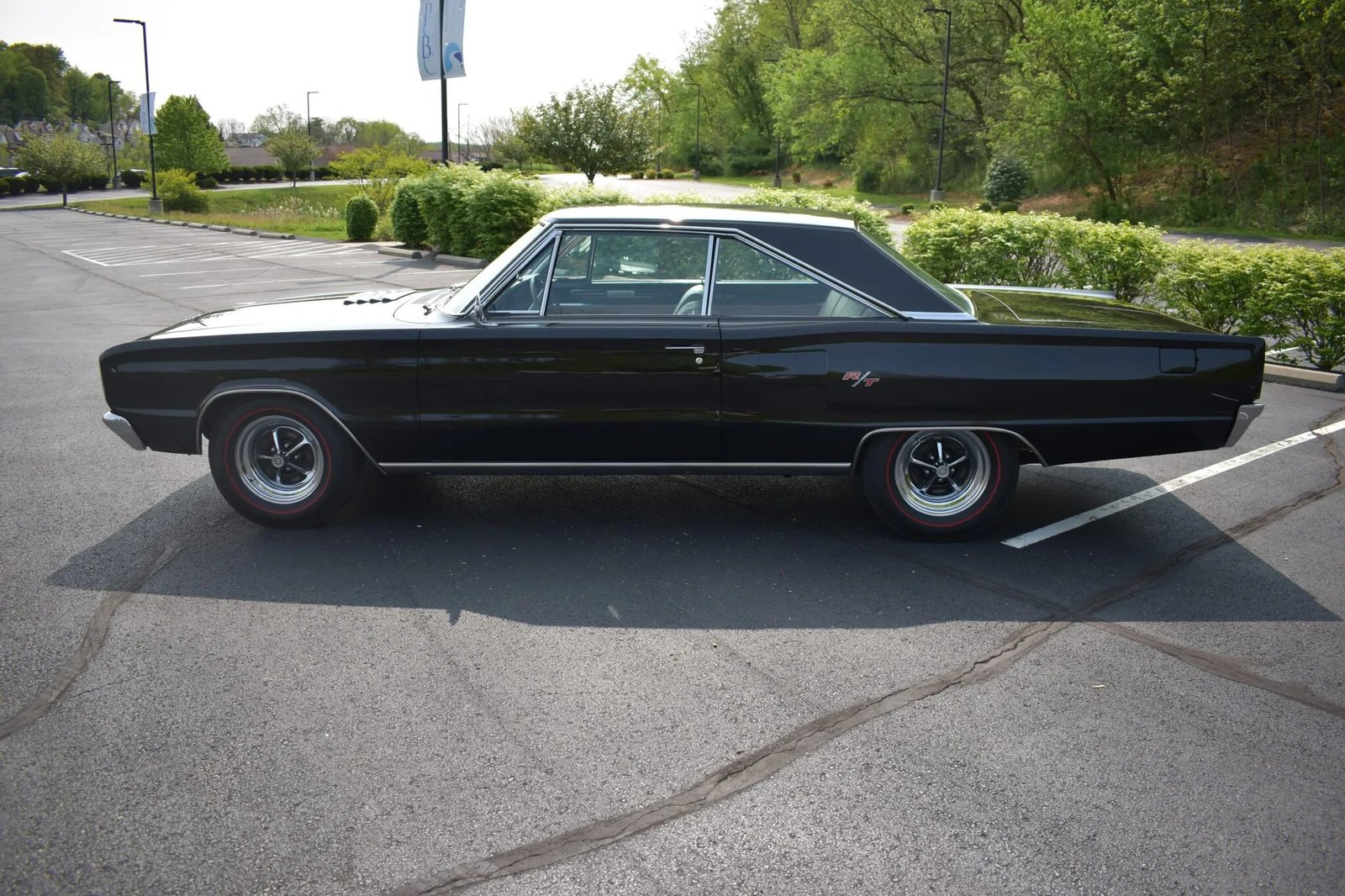 This 1967 Dodge Coronet R/T coupe is powered by a 440ci V8 paired with a three-speed TorqueFlite automatic transmission. Work have involved rebuilding the engine, transmission, and rear axle along with replacing the quarter panels and repainting the body in black. Copper-colored trim adorns the interior, and additional equipment includes an Edelbrock carburetor, Magnum 500–style wheels, power steering, power brakes, chrome bumpers, quad headlights, a louvered hood, front bucket seats, bright interior trim, and a push-button AM radio.