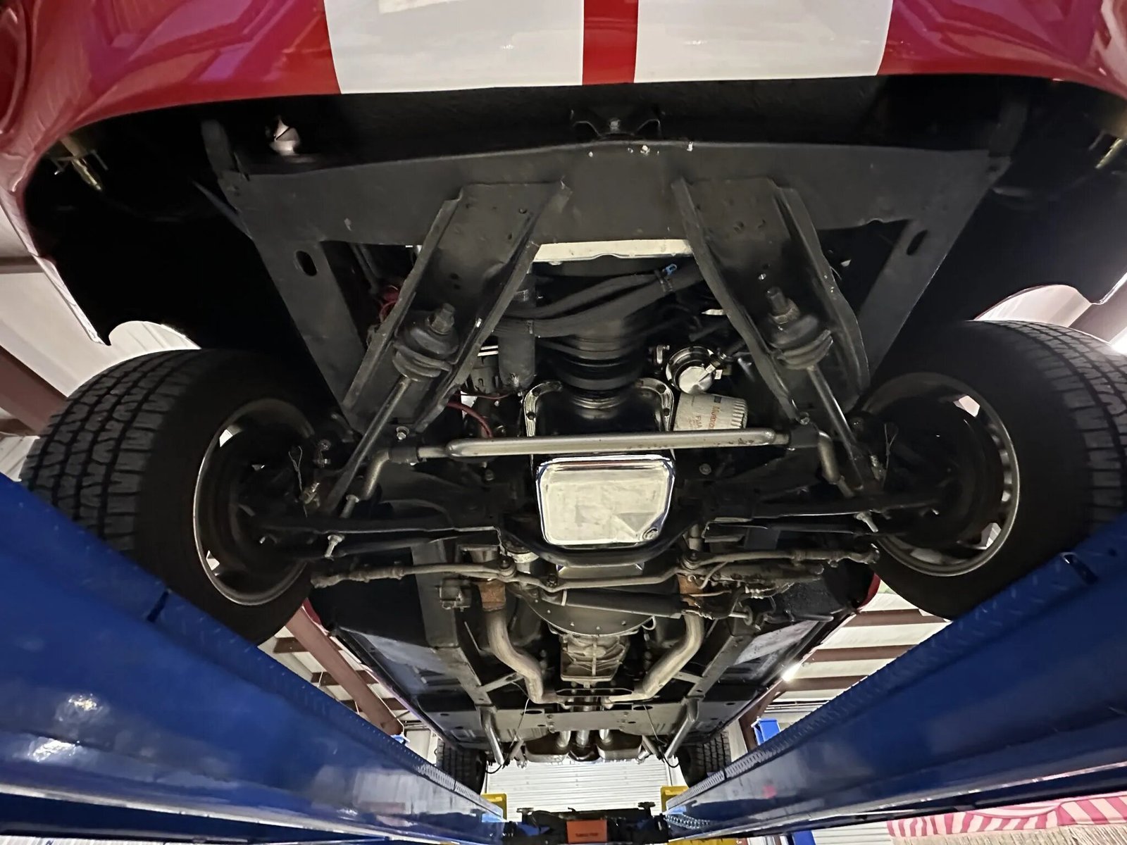 The quarter panels, fenders, doors, hood, trunk lid, side scoops, taillight panel, and fiberglass front nose were replaced with GT350-style pieces before the exterior was refinished in red with white over-the-top stripes.