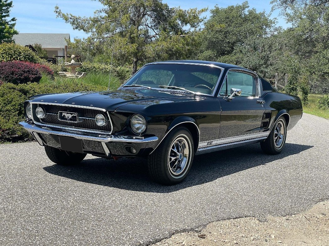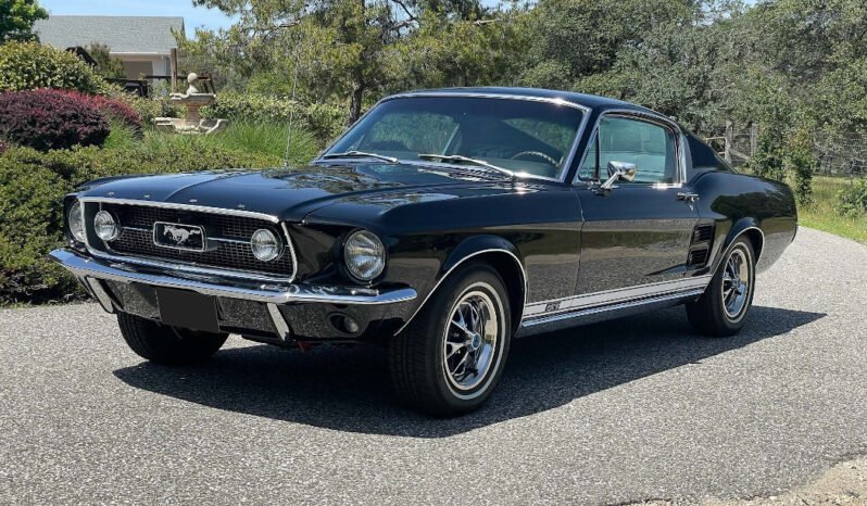 This 1967 Ford Mustang fastback was delivered new with GT equipment, an S-code 390ci V8, and a four-speed manual transmission. The exterior was refinished in black, the interior was redone in black, the engine bay was repainted, the front floor pans were replaced, the brightwork was refreshed, and the gearbox was rebuilt. Features include 14″ styled steel wheels, whitewall tires, power-assisted brakes with front discs, power steering, a folding rear bench seat, a center console, and an AM radio.