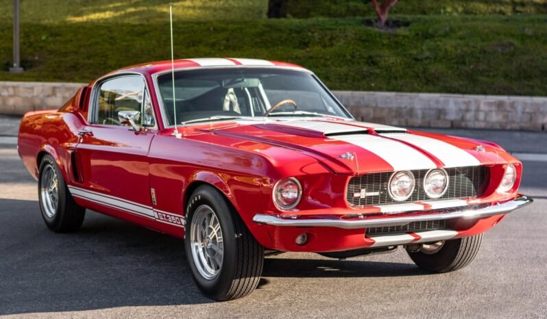 This 1967 Ford Mustang fastback is finished in red with white stripes over black vinyl upholstery and was refurbished and modified in the style of a Shelby Mustang GT350. The car is powered by a replacement 302ci V8 paired with a five-speed manual transmission, and additional features include a 3.55:1 limited-slip differential, 15″ Shelby-style wheels, front disc brakes, power steering, a hood scoop, bright interior trim, a wood-rimmed steering wheel, a Hurst shifter, and an Alpine stereo receiver.