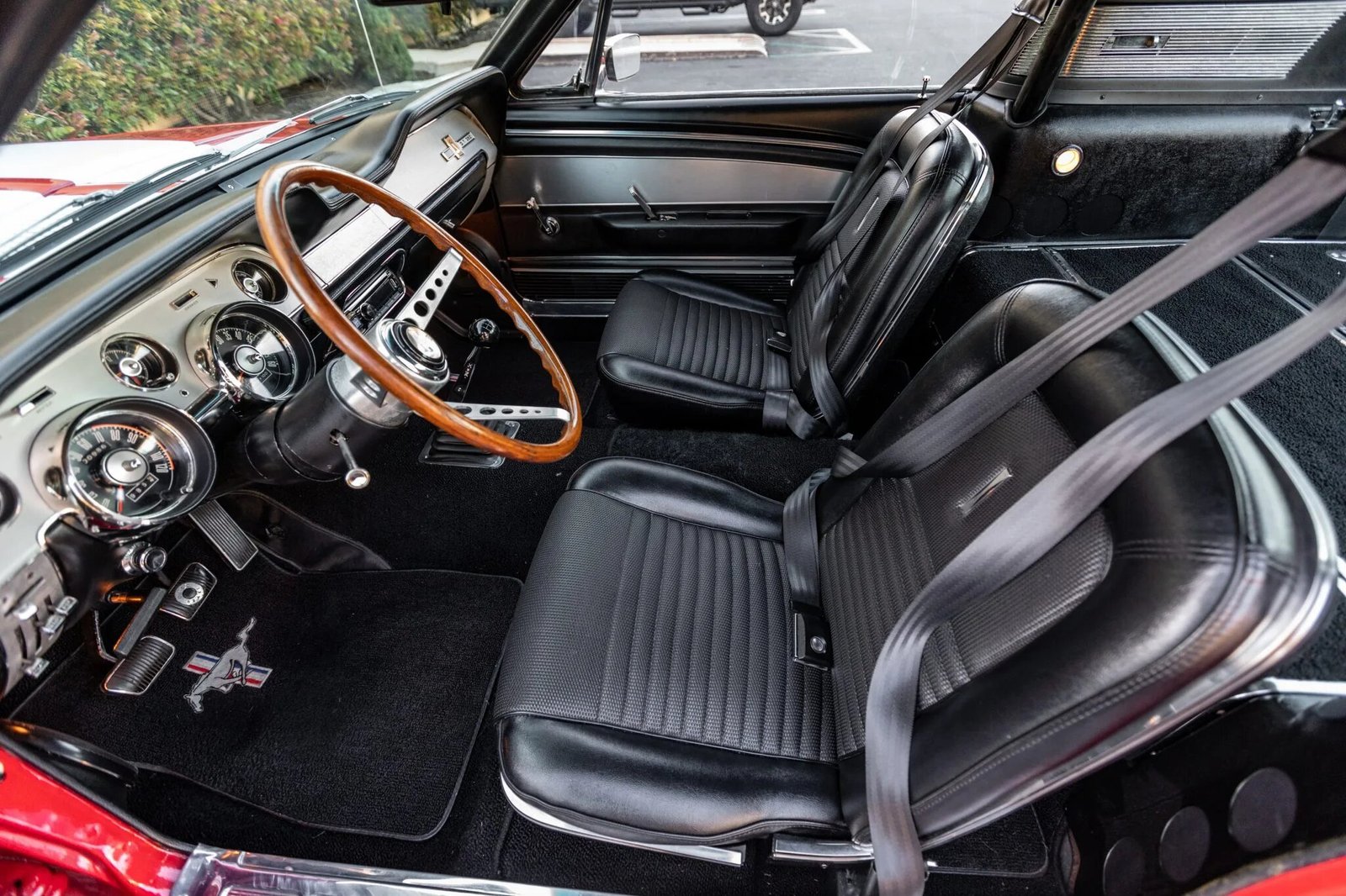 The wood-rimmed steering wheel features a Shelby center emblem and is mounted to a tilting column.