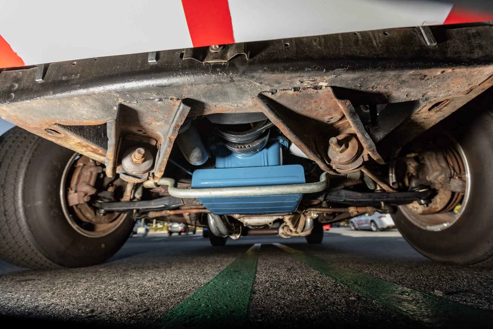 GT350-style body panels were installed before the body was repainted in its current shade of red with white stripes.