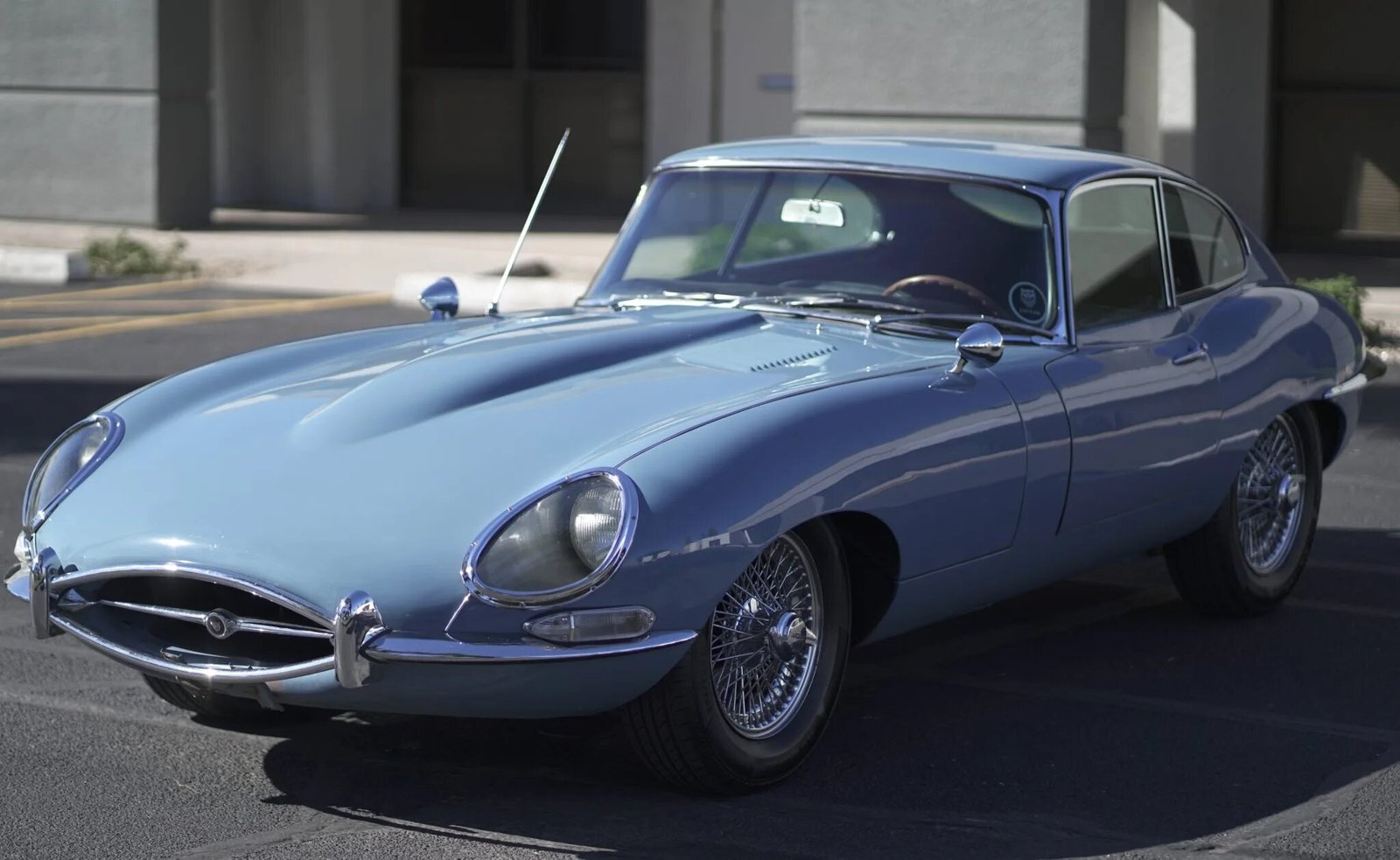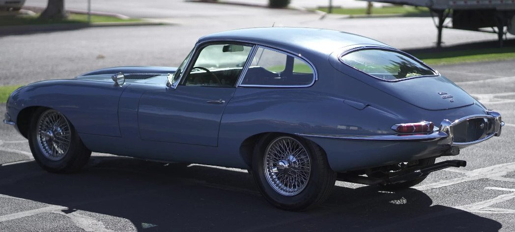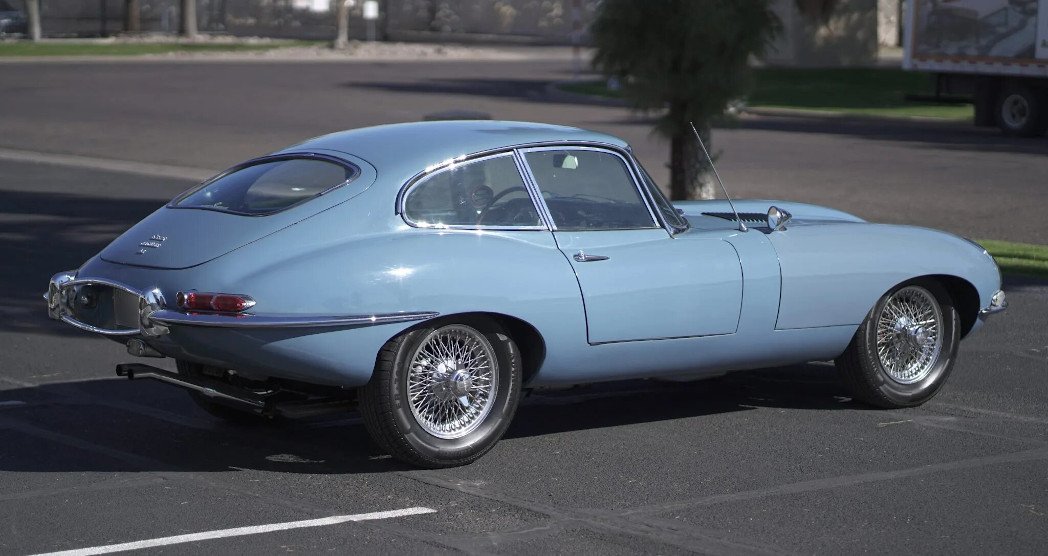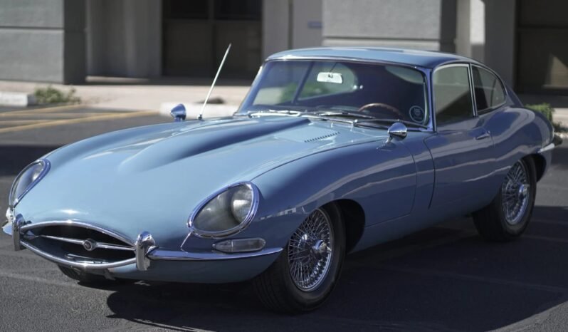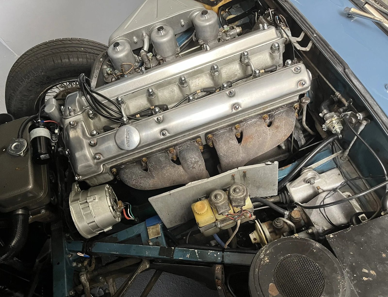 Finished in light blue over dark blue leather upholstery, the car is powered by a 4.2-liter inline-six equipped with triple SU carburetors and paired with a four-speed manual transmission.