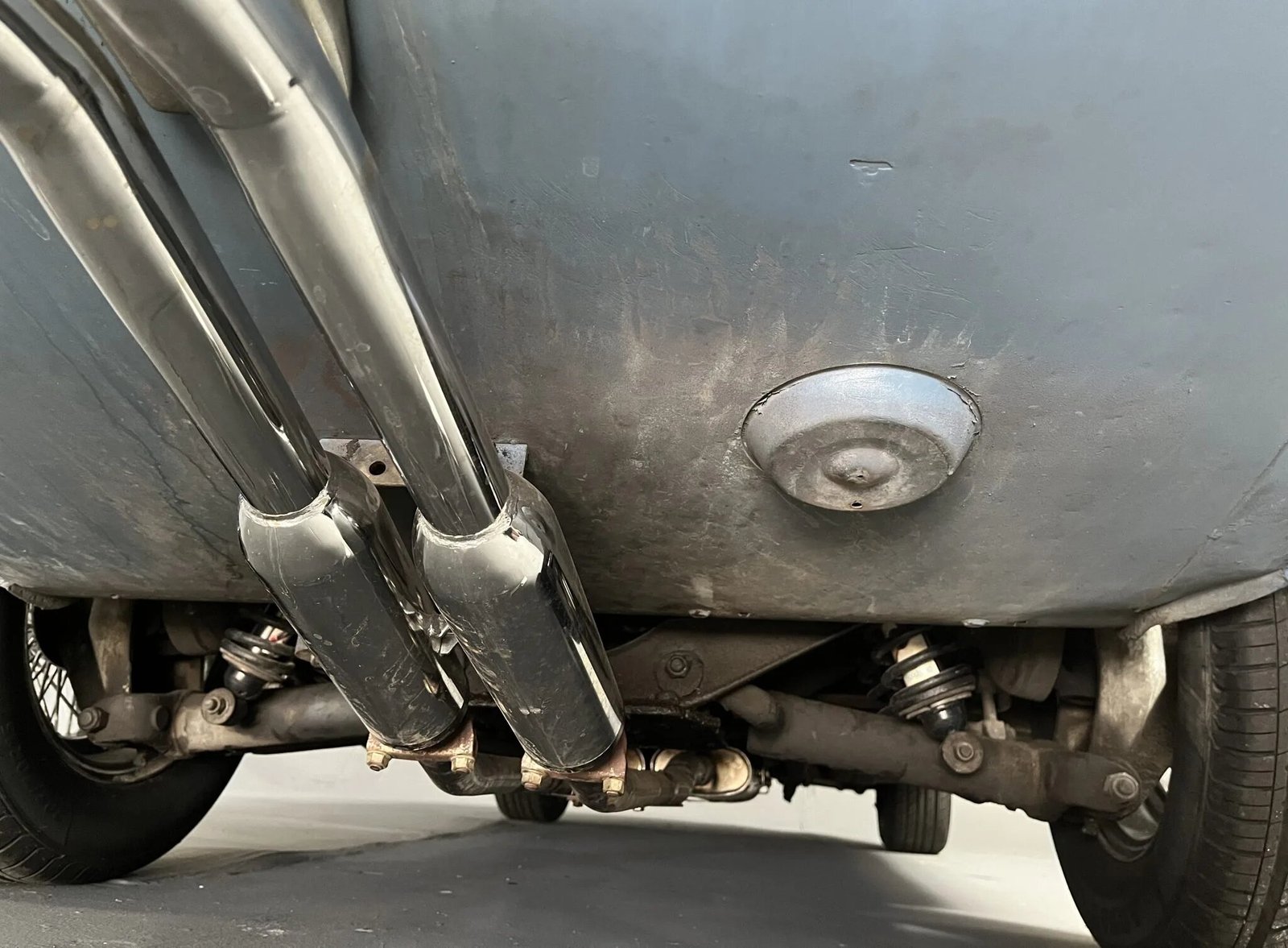 Polished 15” wire wheels are secured by two-eared knock-off spinners and mounted with 205/70 Advanta tires that were installed in 2024.