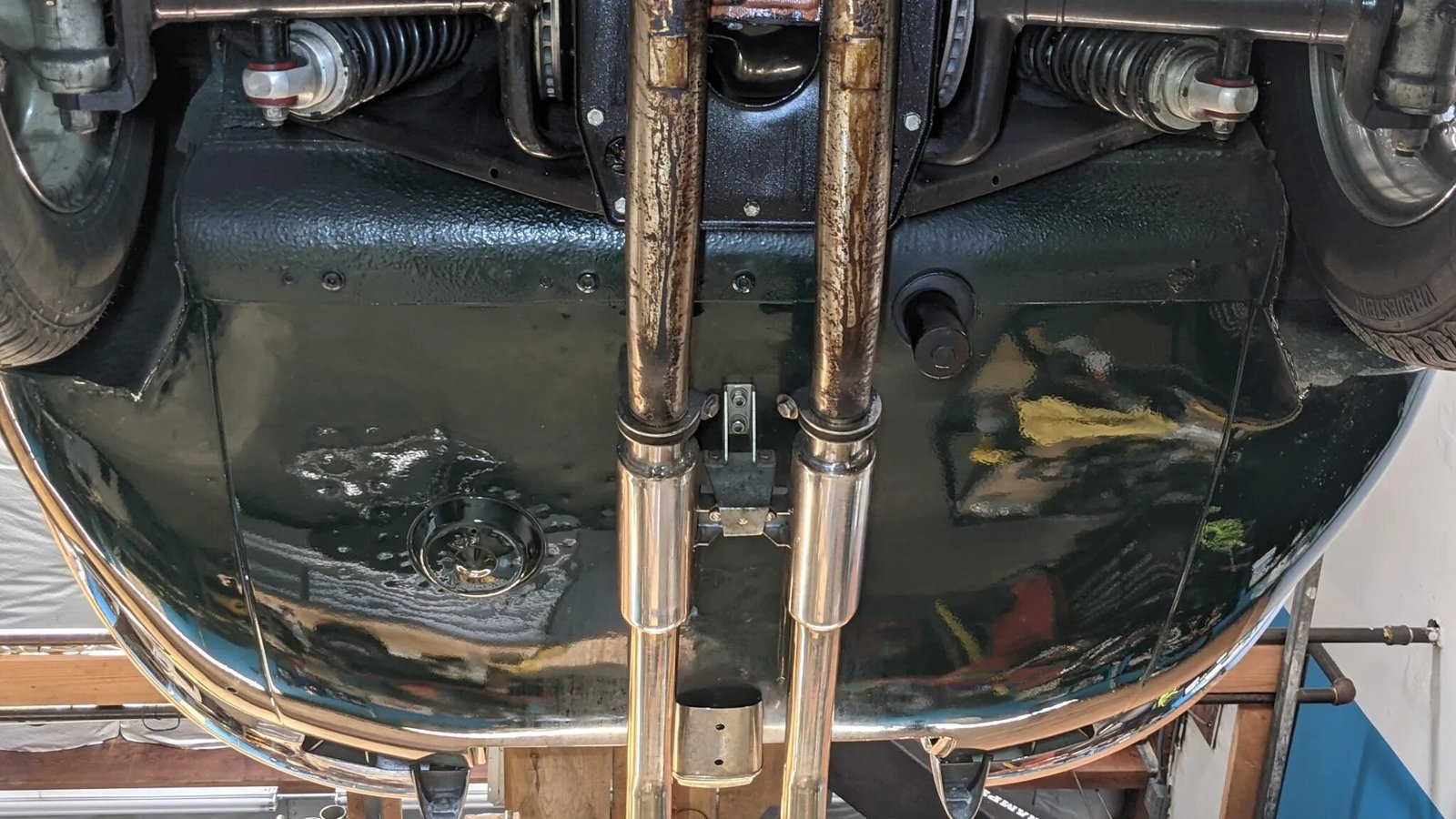 The car was disassembled and repainted in its current shade of green in 2000, at which time the brightwork was refinished.