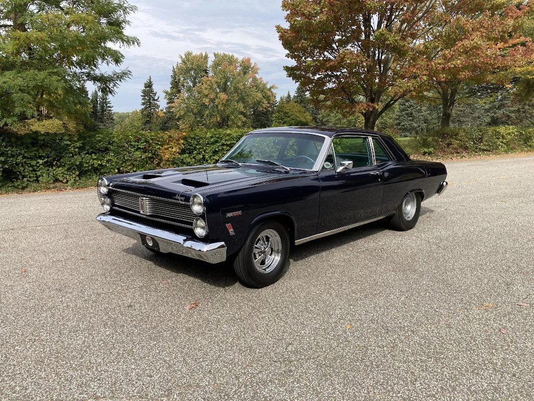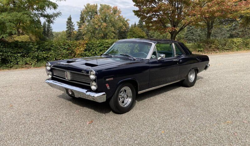 This 1967 Mercury Comet 202 is one of 22 R-code two-door sedans that were produced with a 427ci Side-Oiler V8 mated to a Toploader four-speed manual transmission. n. The car was built on April 18, 1967. It was fitted with a replacement engine and modified for drag racing in 2006. Finished in dark blue over blue fabric and vinyl upholstery, the vehicle features a fiberglass hood with pins, dual Holley carburetors, a 4.56 limited-slip differential, front disc brakes, and rear drag slicks.