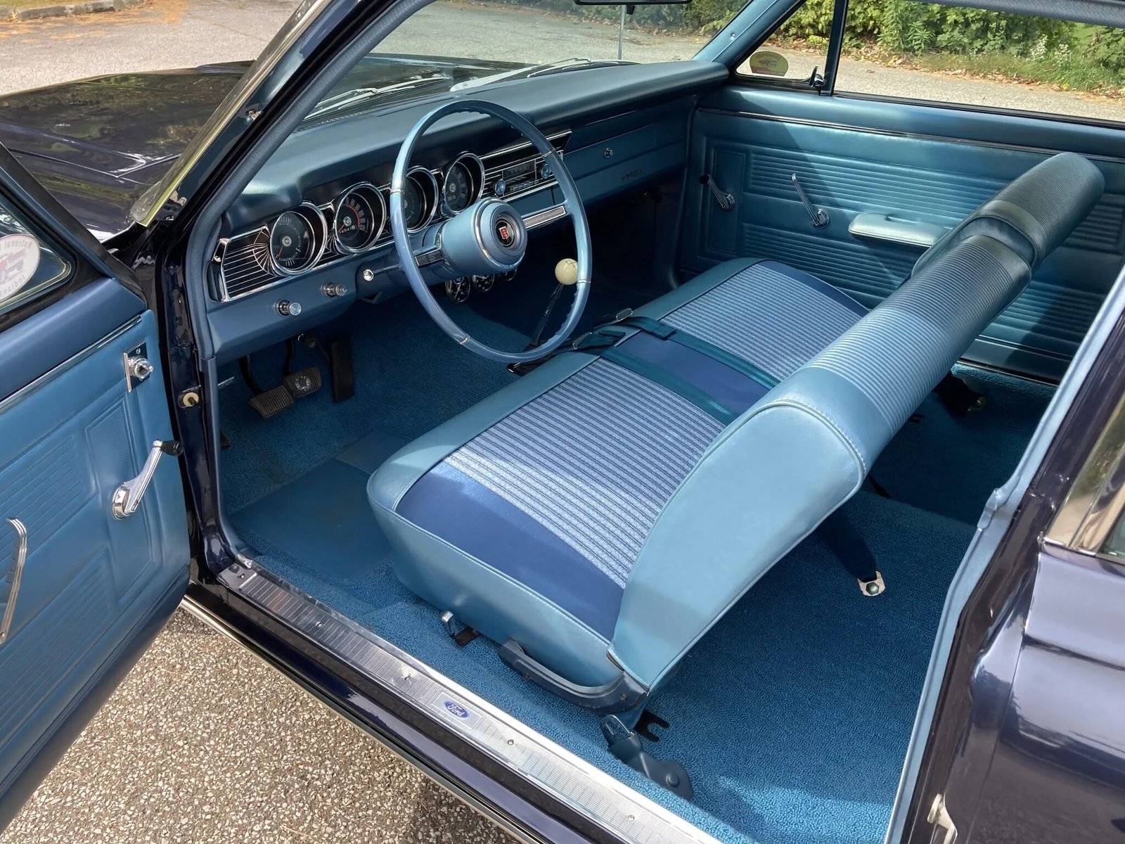 The cabin houses two rows of bench seats trimmed in blue vinyl and fabric upholstery. Blue loop carpets line the floors, and amenities include front lap belts, a Mercury-branded push-button AM radio, a Hurst shifter, and opening front 3/4 vent windows. The removed shifter is included in the sale.