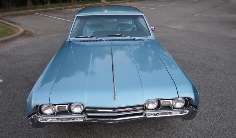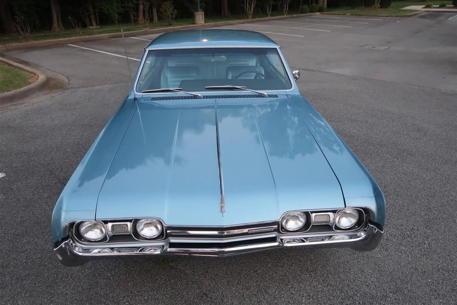 The car was finished from the factory in Crystal Blue (D), features include a pillarless roofline, chrome wheel arch and bodyside trim, Cutlass badging, and quad headlights.