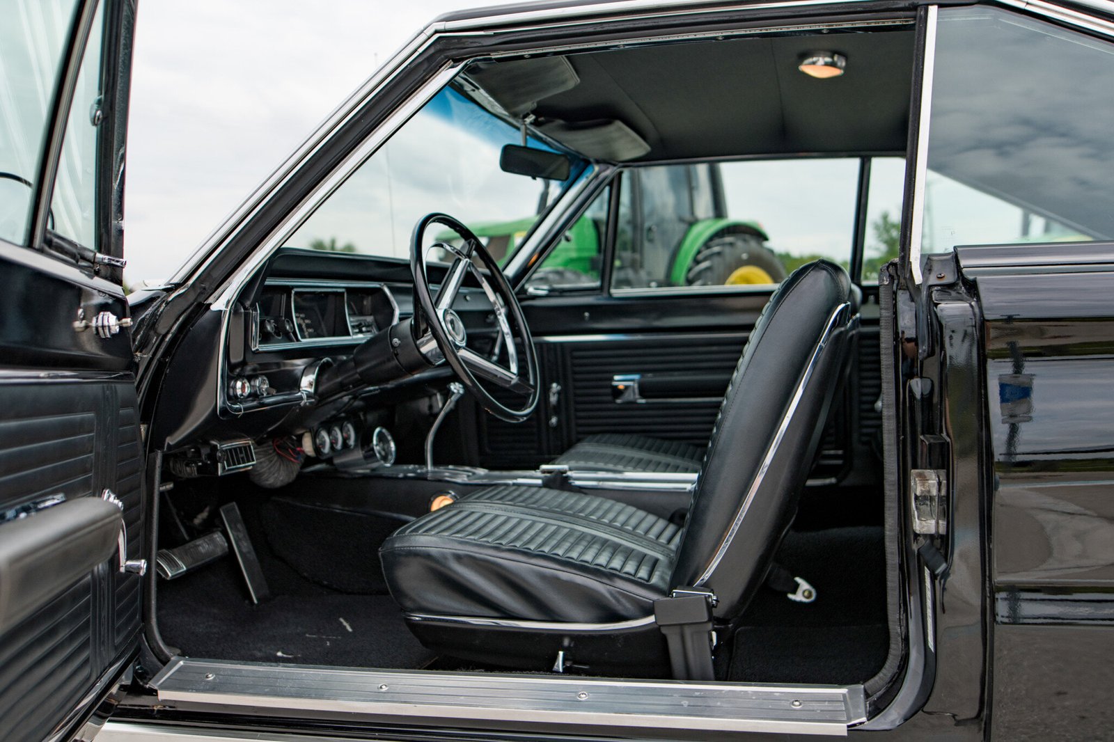 The interior is has been retrimmed in black vinyl and features bucket seats, a console-mounted tachometer, and aftermarket oil pressure, water temperature, and amperage gauges under the dash.