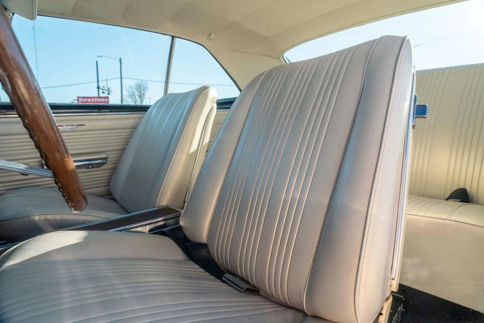 The cabin features front bucket seats and a rear bench that have been reupholstered in Parchment vinyl with matching door panels along with a black dashboard and carpets.