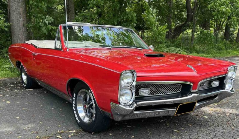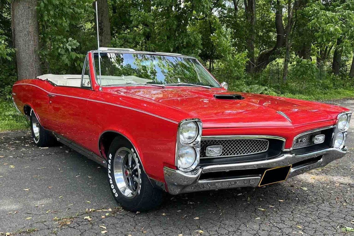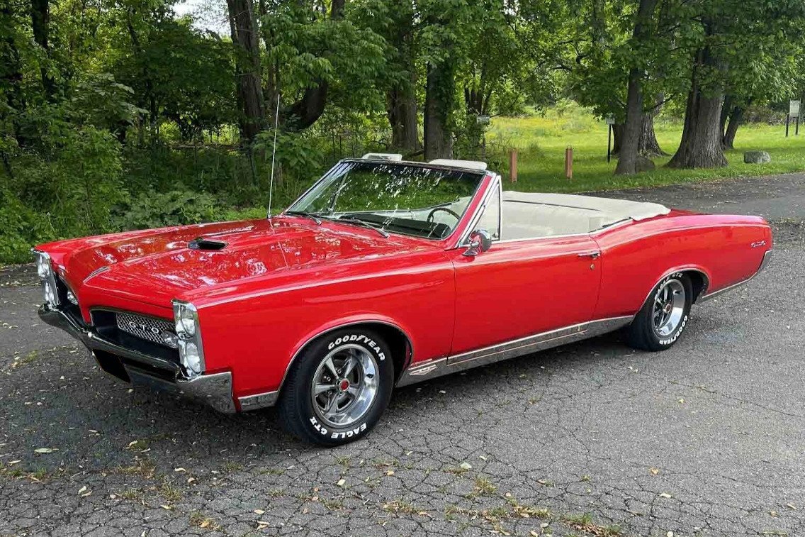 The car has been refinished in red over white, and it is powered by a 400ci V8 paired with a three-speed automatic transmission and a limited-slip differential. Other features include a white soft top with a matching boot cover, 15″ wheels, power steering, power brakes, power windows, woodgrain interior trim, a console, and a push-button AM radio. Service have included rebuilding the steering box, power-steering pump, brake booster, master cylinder, carburetor, alternator, starter, and the hydraulic cylinders for the powered top as well as as well as replacing the fuel and brake lines, starter wiring, taillight harness, control-arm bushings, tie rods, brake lines, and body mounts.