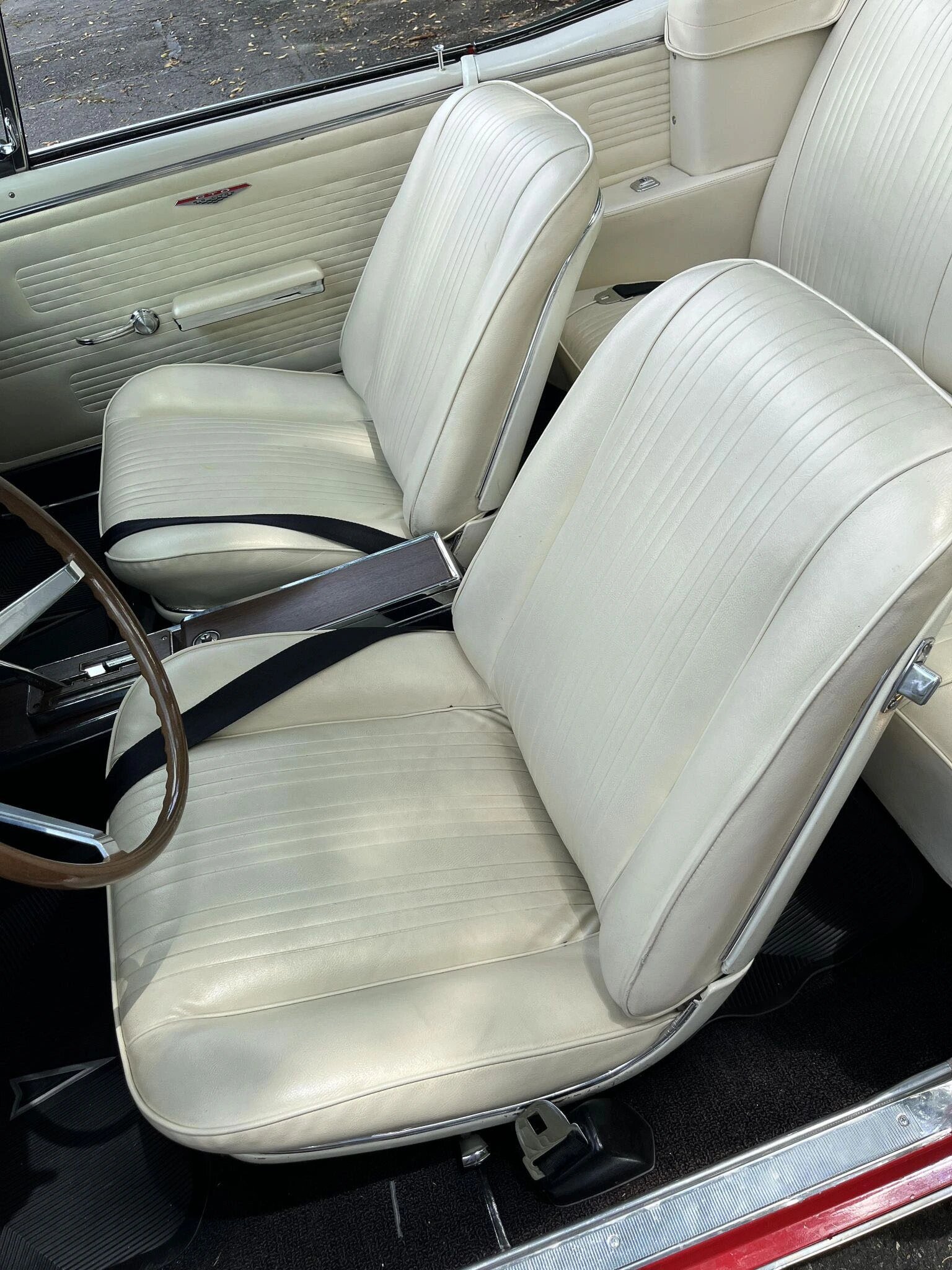 The front bucket seats and rear bench are trimmed in white, with matching door panels contrasted by black carpeting.
