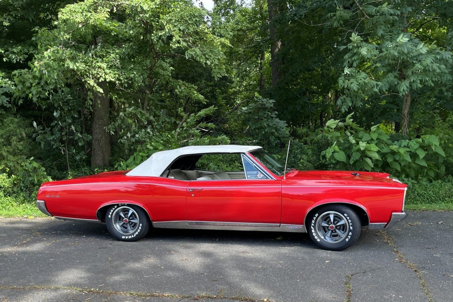 Styled 15″ wheels wear polished trim rings as well as red PMD center caps and are mounted with 235/60 Goodyear Eagle GTII white-letter tires.