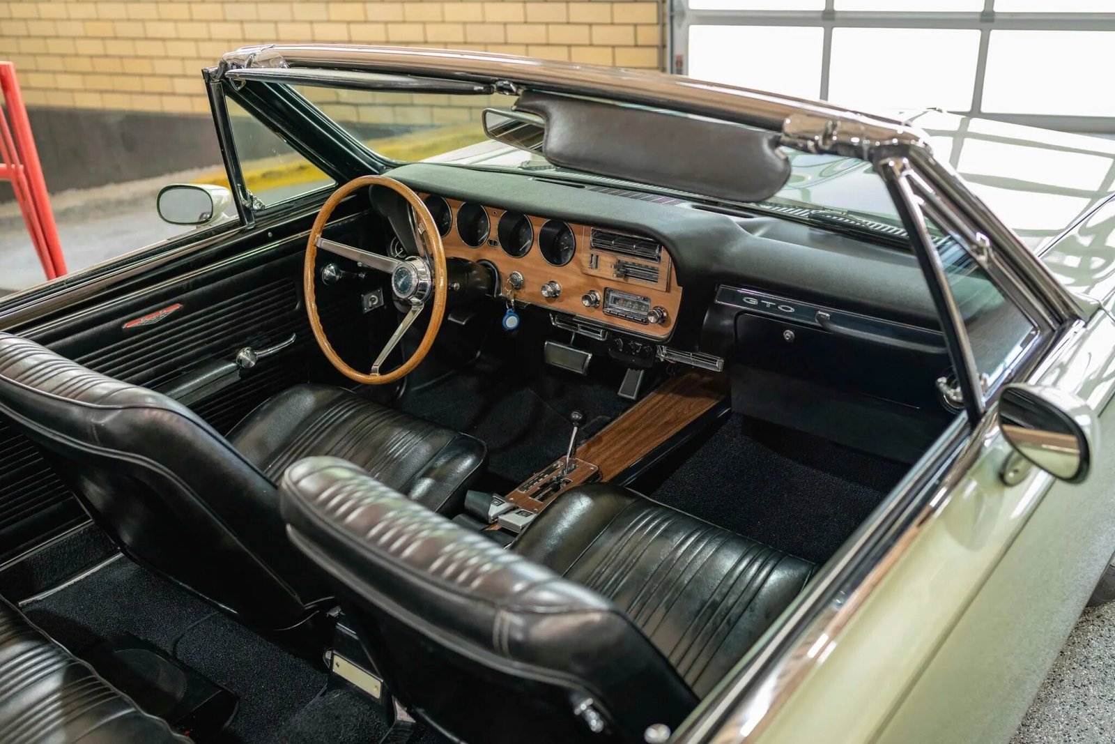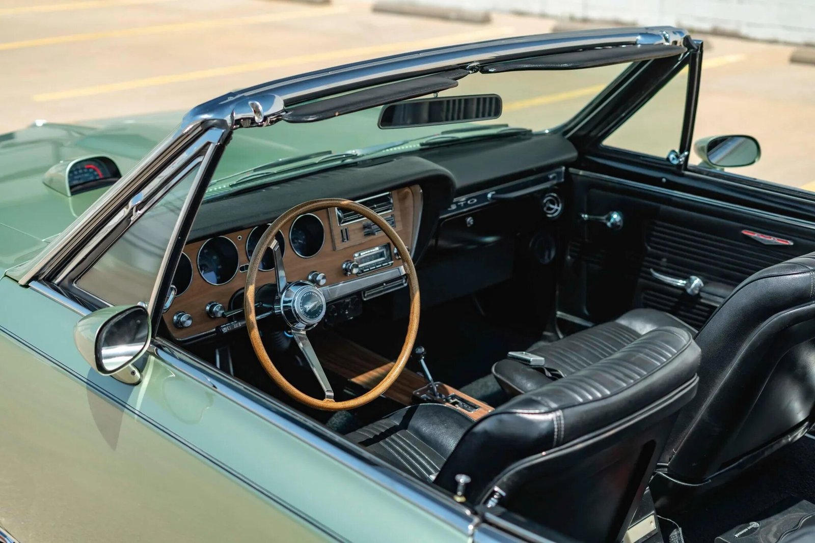 Lap belts are equipped for the front and rear passengers, and amenities include a Vintage Air climate control system and an AM/FM radio with aftermarket speakers.