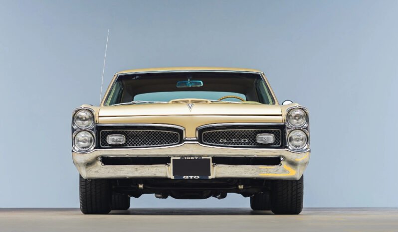 This 1967 Pontiac GTO hardtop coupe is finished in Signet Gold over a gold vinyl interior and powered by a replacement 400ci V8 paired with a four-speed manual transmission.