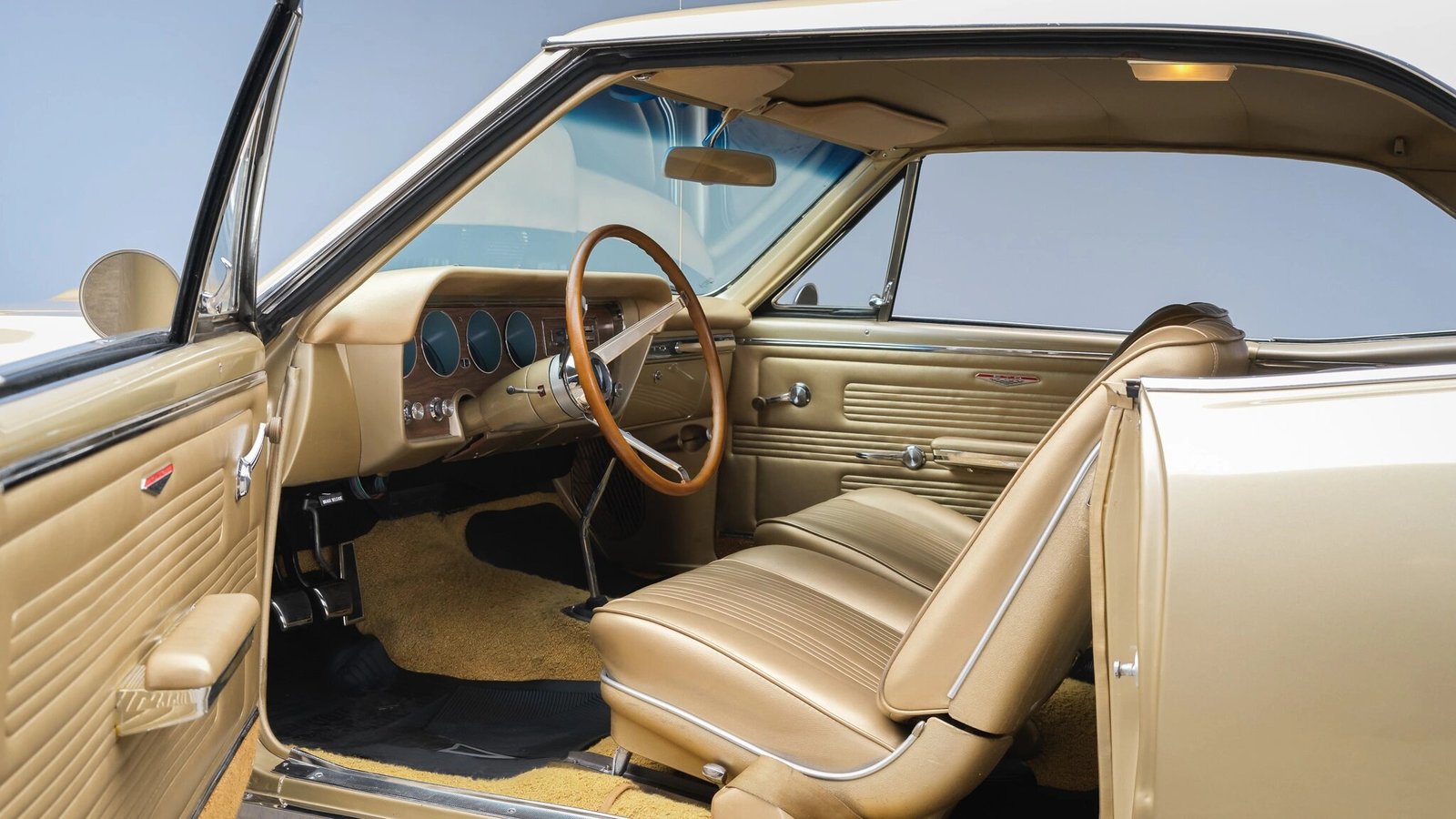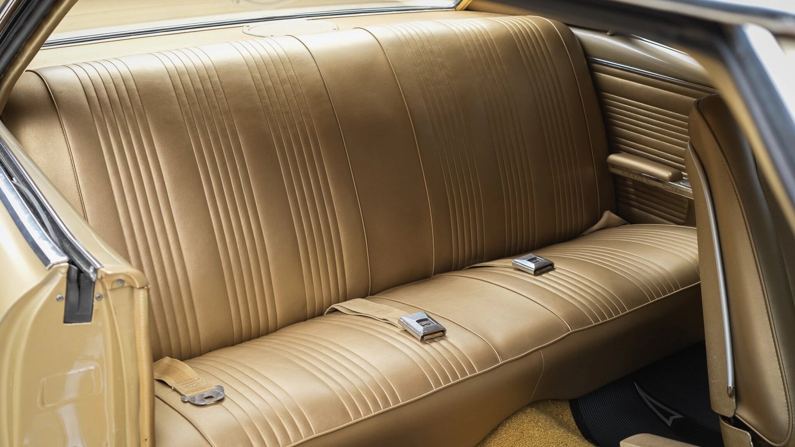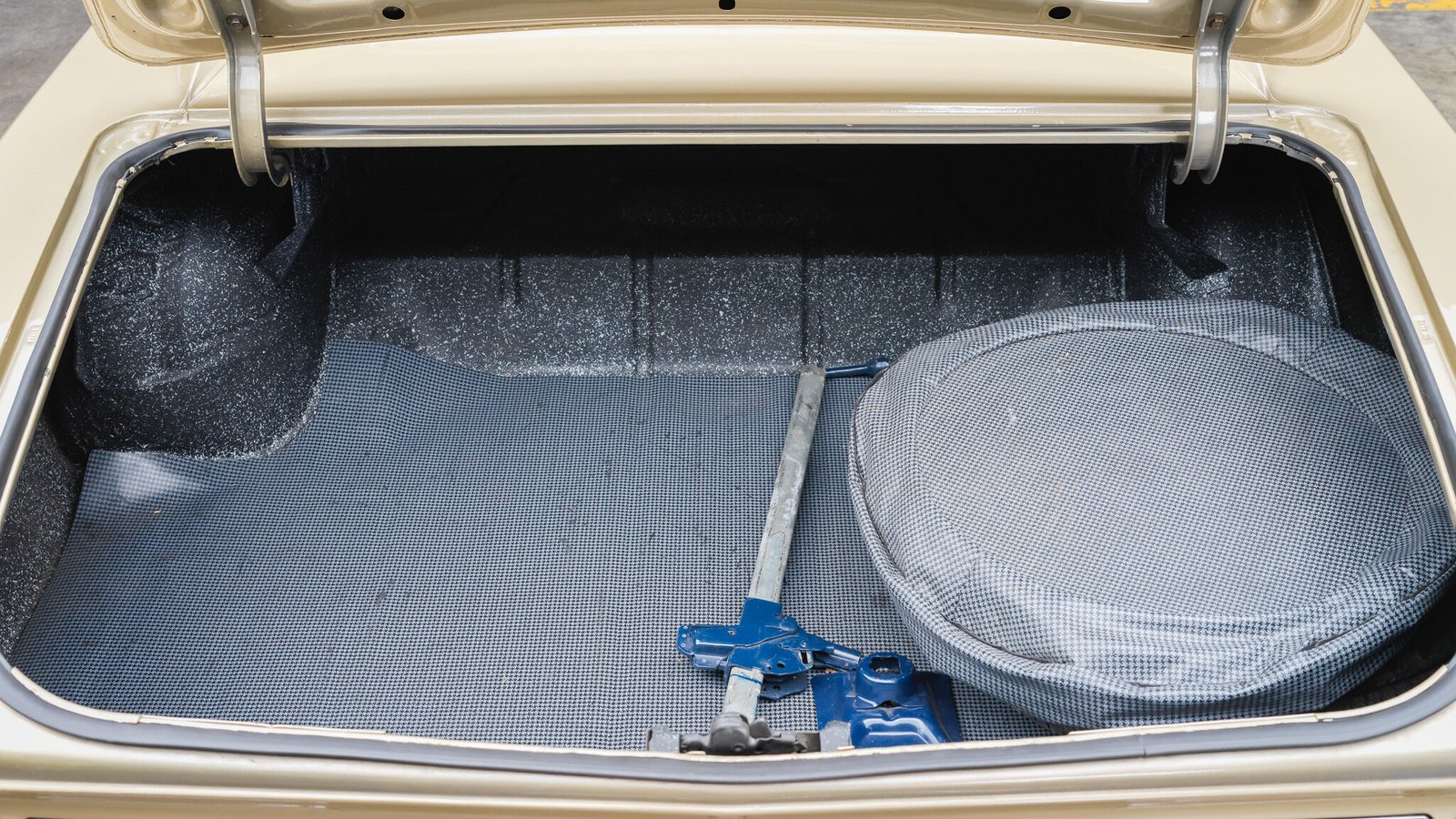 The interior was reupholstered in the factory gold vinyl and features a matching dashboard, door panels, and replacement carpets.