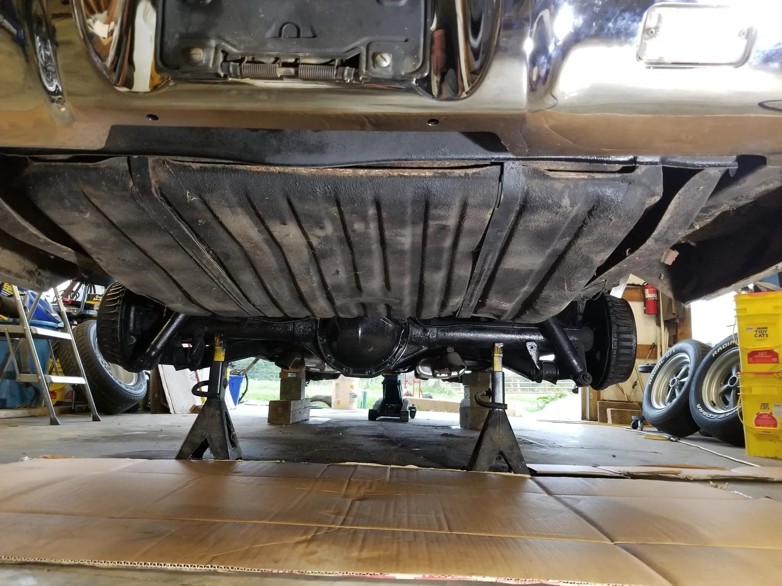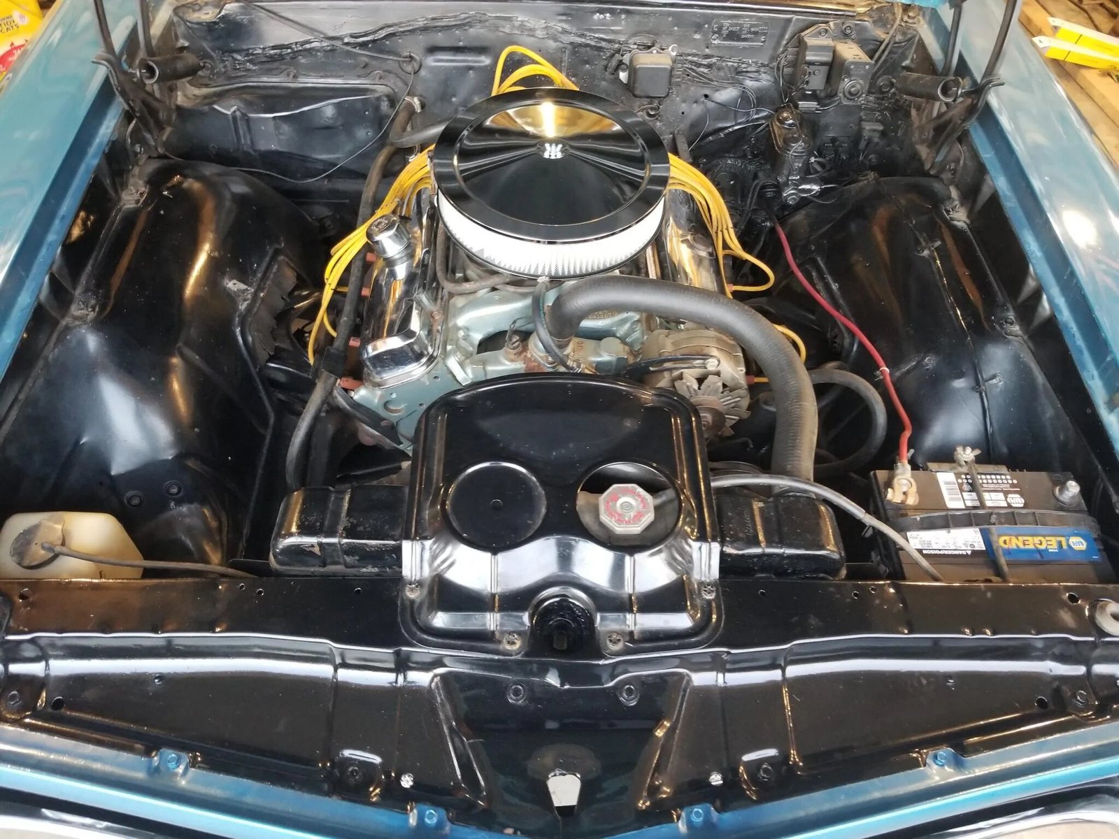 The 400ci V8 have been rebuilt, and features a Rochester Quadrajet four-barrel carburetor, PerTronix electronic ignition, Accel spark plug wires, headers, and a polished air cleaner lid and valve covers. Power is delivered to the rear wheels through a Muncie four-speed manual transmission and a 12-bolt rear axle. A dual exhaust system has been installed that exits before the rear axle.