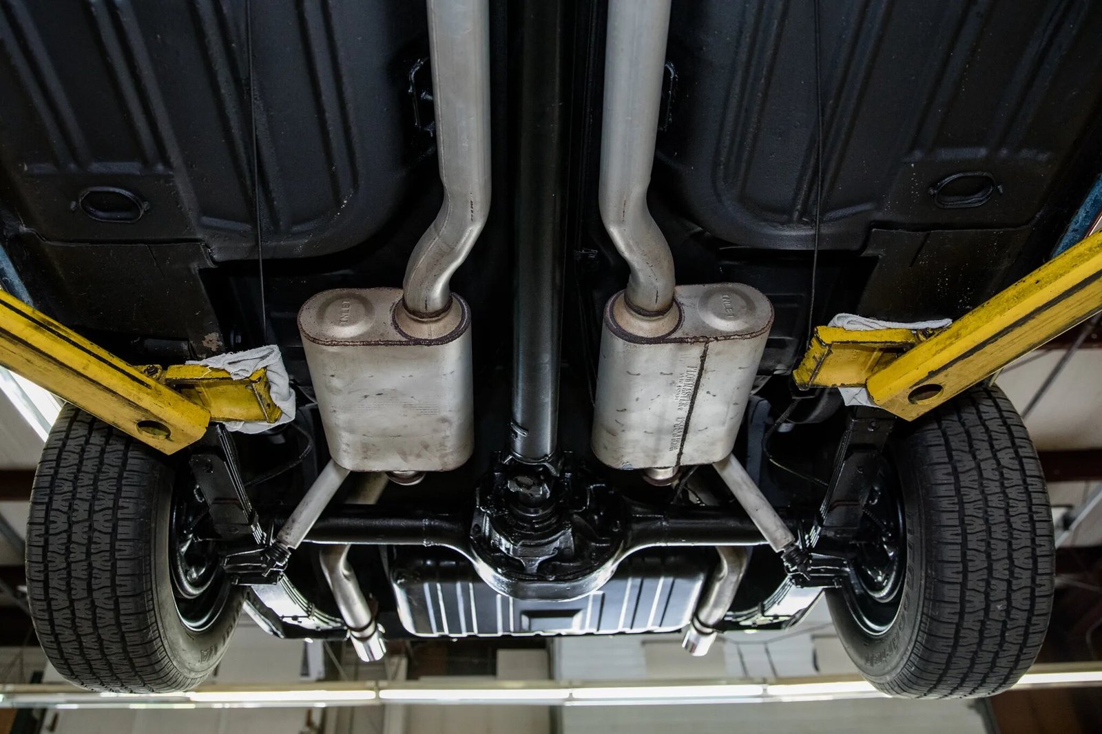The car left the factory finished in Lime Gold and was refinished in blue with white stripes. Early production examples for the model year featured a one-piece grille, inboard high-beam lights, upper side scoop marker lights, functional lower brake scoops, and polished rear valance trim. Further exterior details include a vented fiberglass hood and nose extension, a fiberglass trunk lid with a ducktail spoiler, hood pins, a left mirror, and dual exhaust outlets.