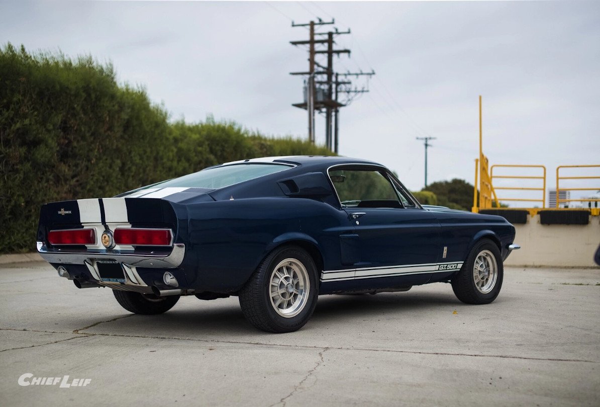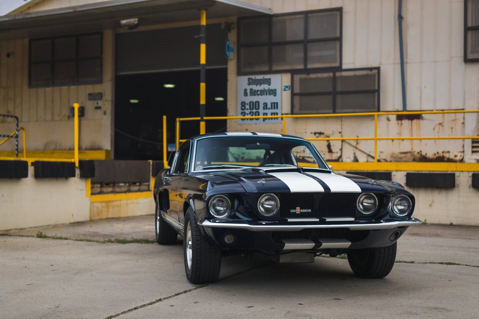 The car is finished in Night Mist Blue with white stripes over black knit vinyl upholstery and powered by a 428ci V8 paired with a 4-speed manual transmission.