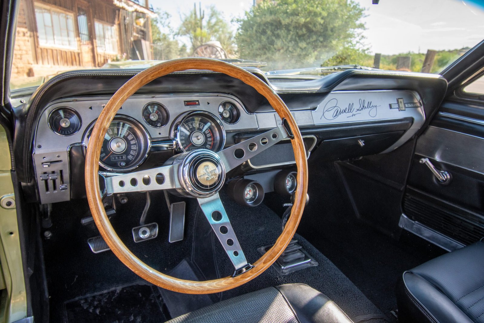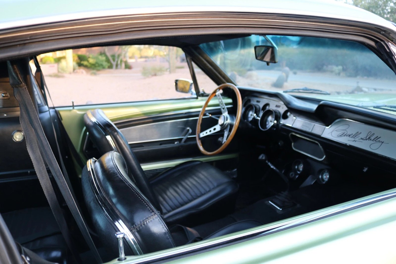 Equipment unique to Shelby models comprises a wood-rimmed steering wheel with a branded horn button and a roll bar with inertia-reel shoulder harnesses.