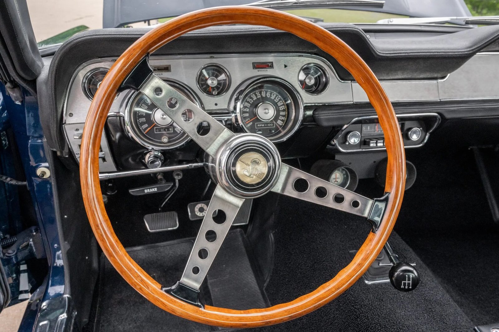 The wood-rimmed steering wheel is fitted with a Shelby horn button and frames a 140-mph speedometer and a tachometer with a 6k-rpm redline.