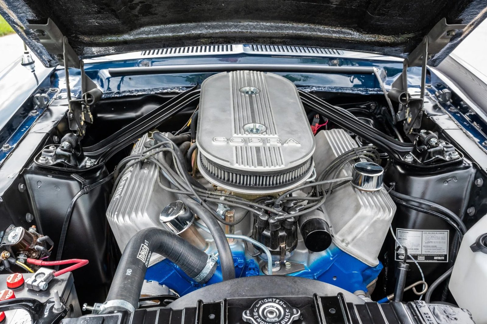 The 15″ 10-spoke wheels wear Shelby Cobra center caps and are mounted with F70-15 Goodyear white-letter tires.