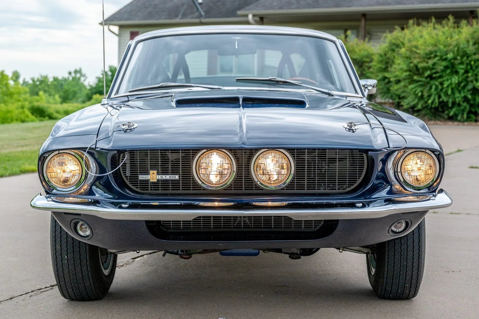 The car was refinished in the factory Nightmist Blue (2) with white GT500 rocker stripes during the refurbishment.