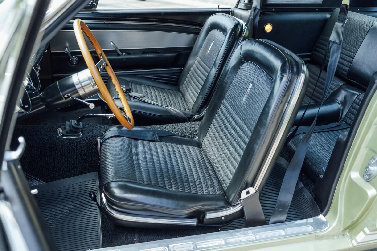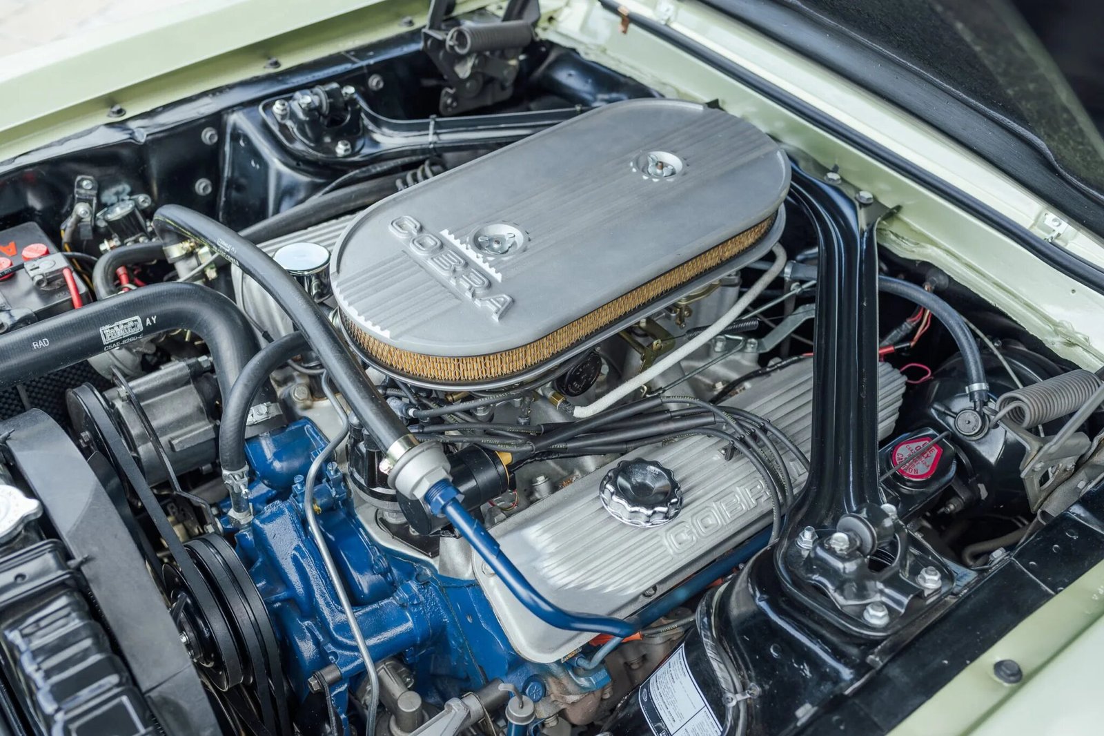 The car is finished in Lime Gold over black vinyl upholstery, and power comes from a 428ci V8 with twin four-barrel Holley carburetors paired with a numbers-matching Toploader four-speed manual transmission.