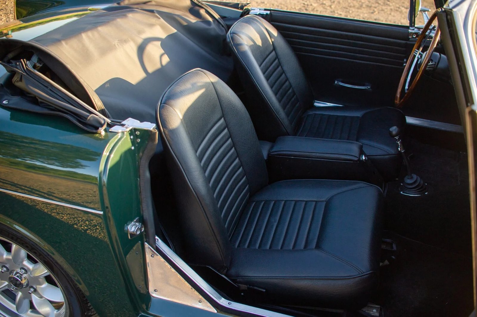 The body is finished in Forest Green (86) and features a black soft top, chrome bumpers with overriders, V8 badging, and dual exhaust outlets.