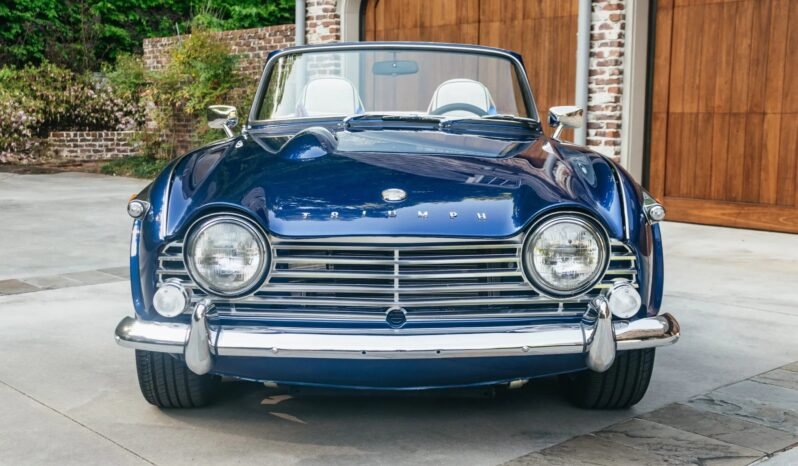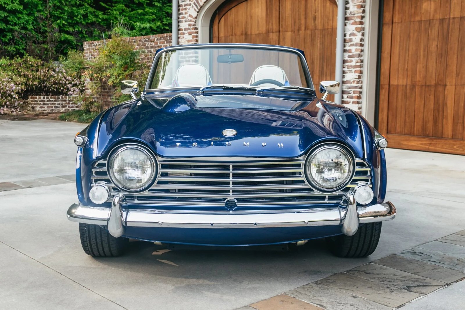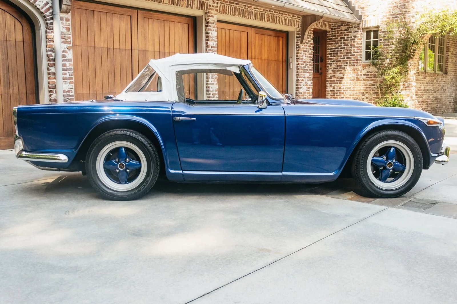 Appointments include a replacement woodgrain dashboard, black carpeting, blue RJS five-point harnesses, a wooden Triumph-branded shift knob, an analog dash clock, and a Bluetooth-capable Alpine stereo head unit, which is paired with speakers in each of the seat headrests.