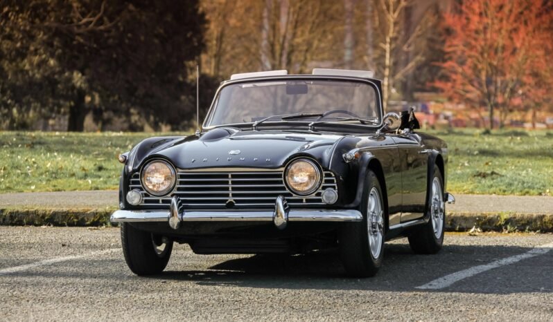 This 1967 Triumph TR4A is finished in black over red vinyl and powered by an overbored 2,186cc inline-four paired with a four-speed manual transmission.