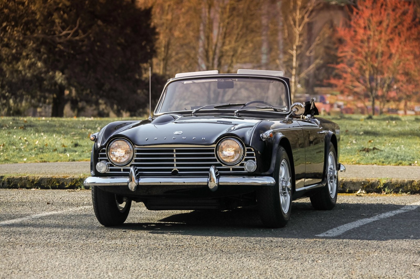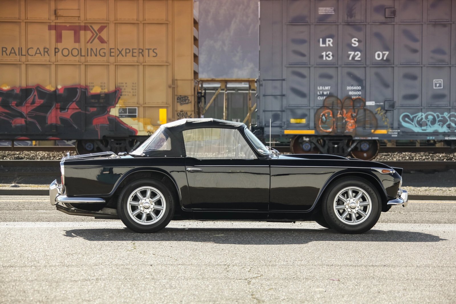 The car was refinished in black and is fitted with a black soft top, chrome bumpers with overriders, a luggage rack, a driver’s side mirror, and a fender-mounted antenna.