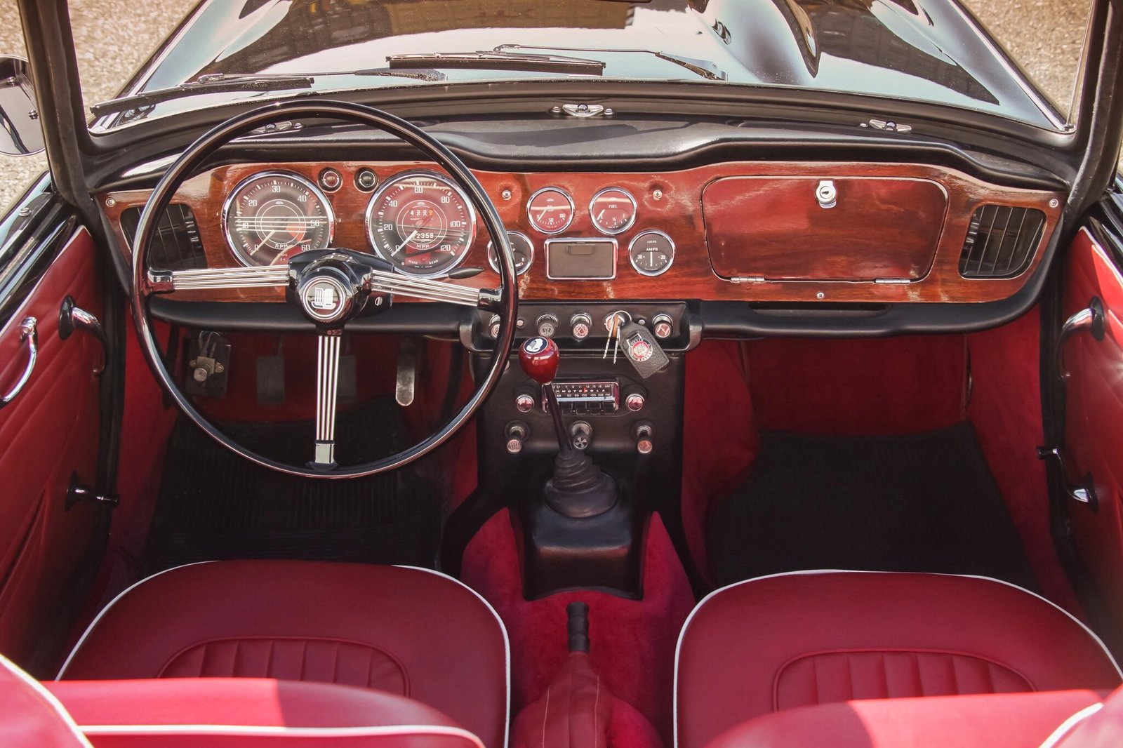 The seats have been reupholstered in red vinyl with white piping, and the carpets have been replaced.
