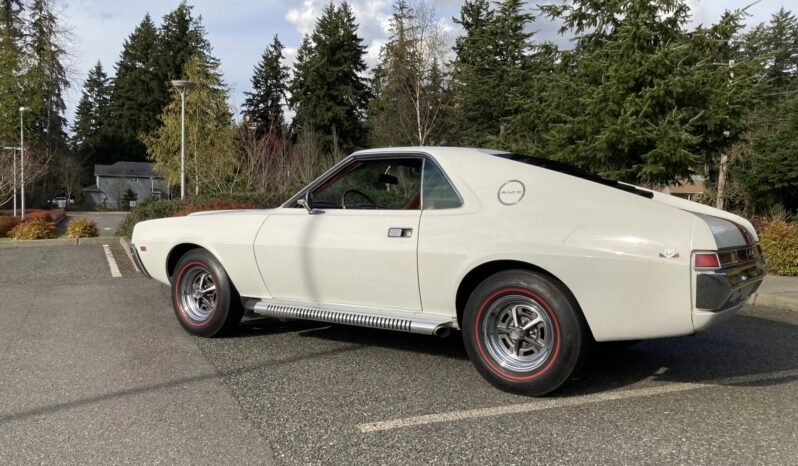 This 1968 AMC AMX 390 is finished in white with red over-the-top stripes and red upholstery and is powered by a 390ci V8 paired with a four-speed manual transmission.