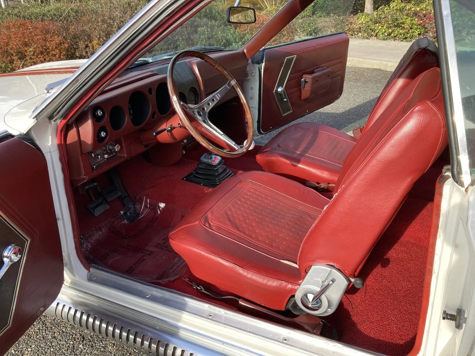 Additional equipment includes a Hurst shifter, lap belts, a locking glove box, and an AM radio.
