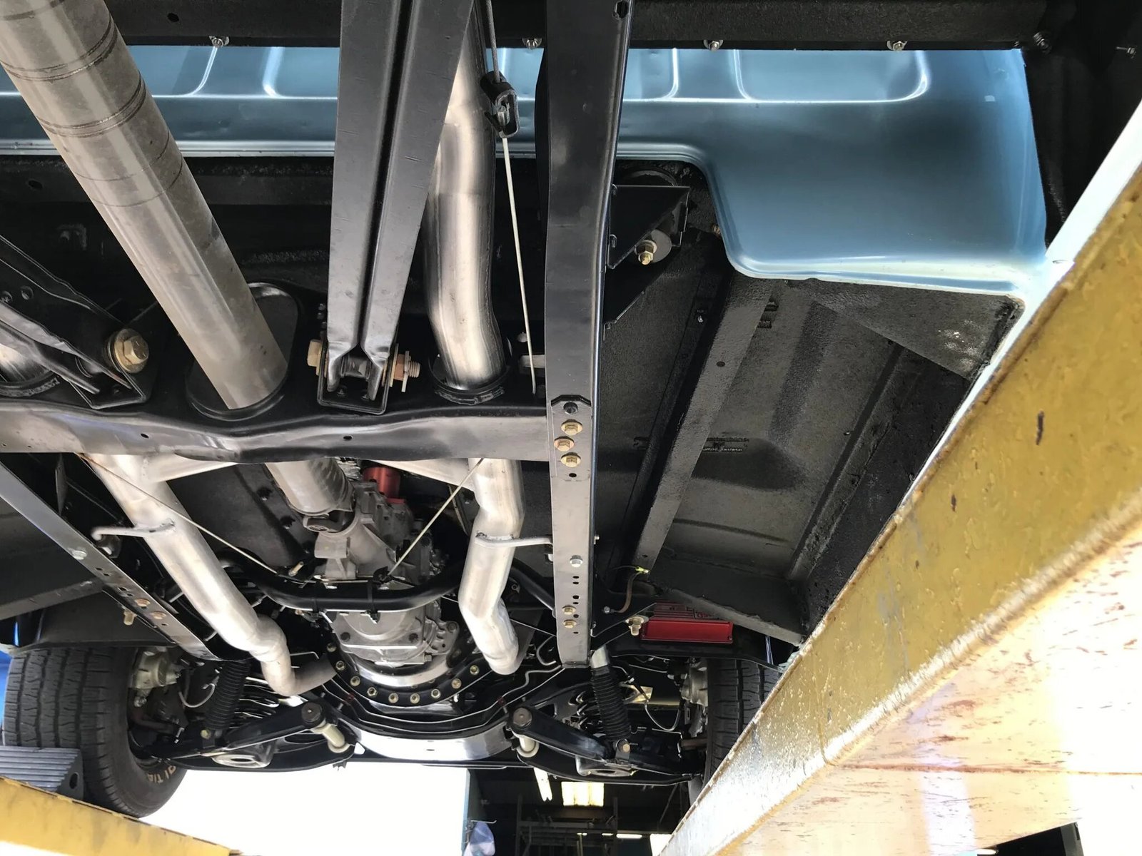 Work including separating the body from the frame, powder-coating of the chassis and suspension components, repainting the body in Trophy Blue, and installing a rebuilt 427ci L88 V8, a Tremec five-speed manual transmission, and an Eaton limited-slip differential.