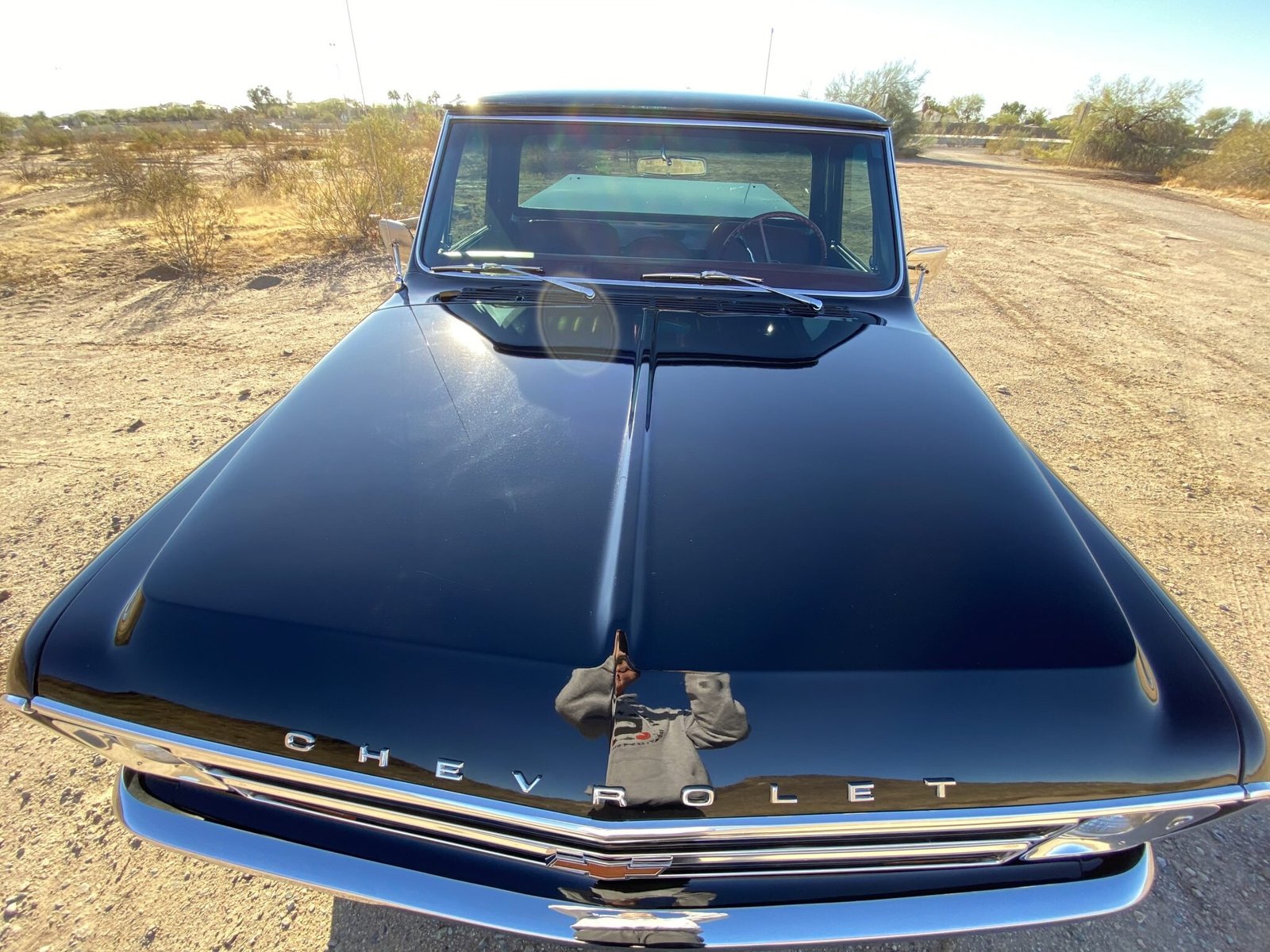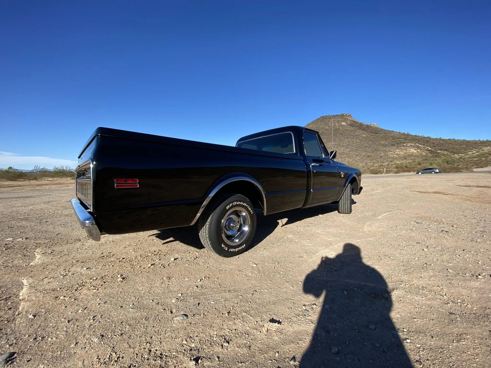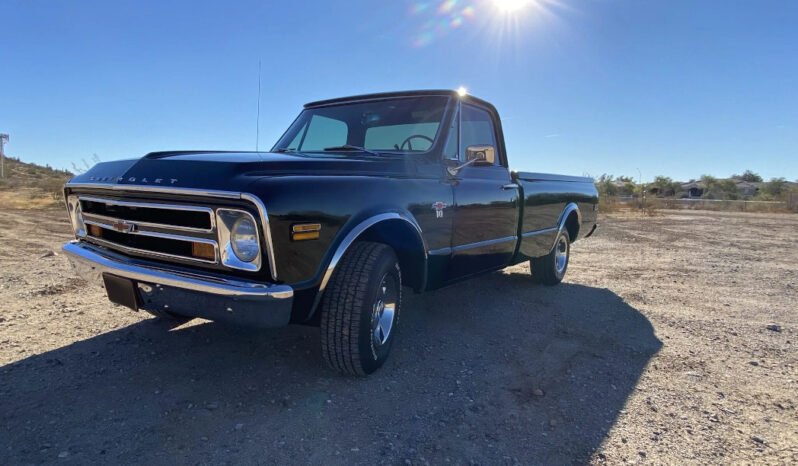 This 1968 Chevrolet C10 Pickup is a long-bed Fleetside pickup that is finished in black over a red interior and is powered by a replacement 350ci V8 crate engine paired with a three-speed Turbo Hydra-Matic automatic transmission.