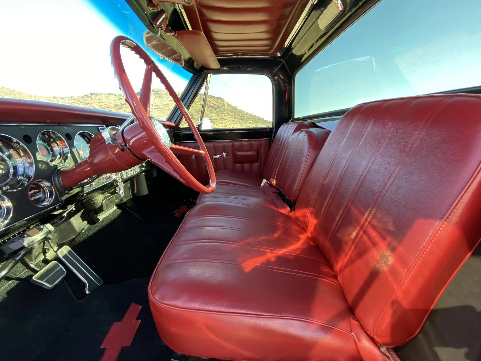 The interior has been re-upholstered in red vinyl and features a split bench seat, matching door panels, black carpeting, and a body-colored dashboard with a red pad.
