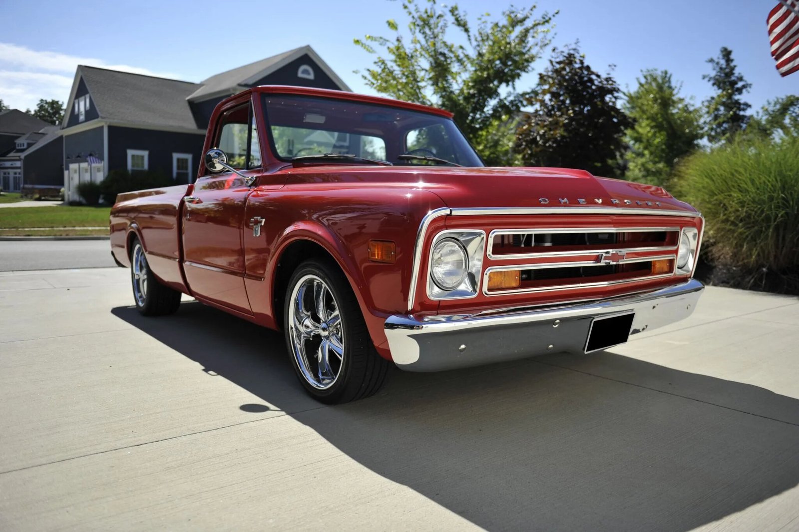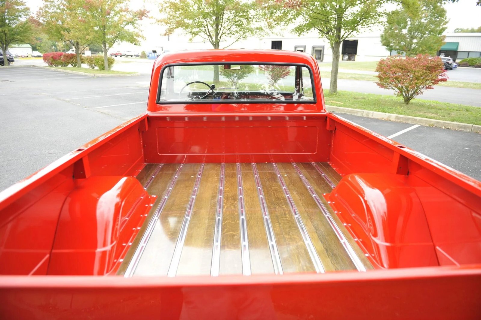 The cab features body-color steel surfaces, black carpets, and a bench seat and door panels that have been reupholstered in two-tone red and black vinyl.