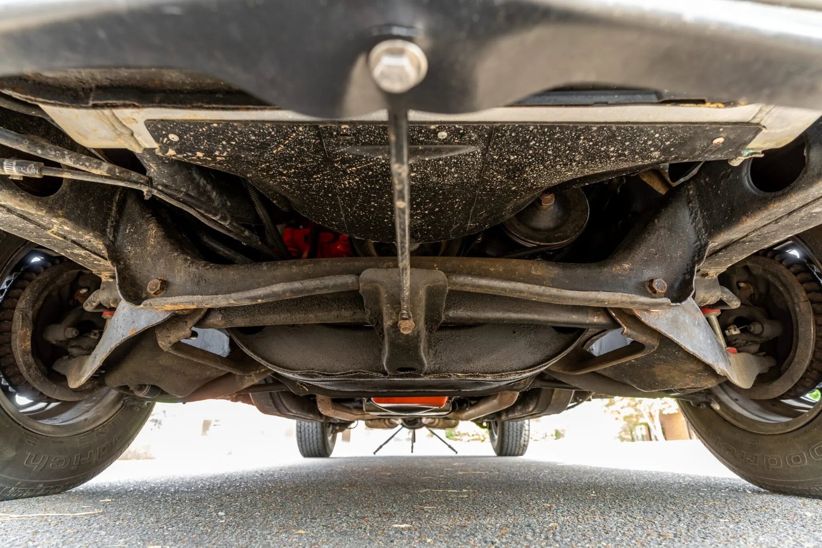 Silver 15″ Rally-style wheels wear chrome hubcaps and trim rings along with BFGoodrich Radial T/A white-letter tires measuring 215/65 up front and 235/70 out back.