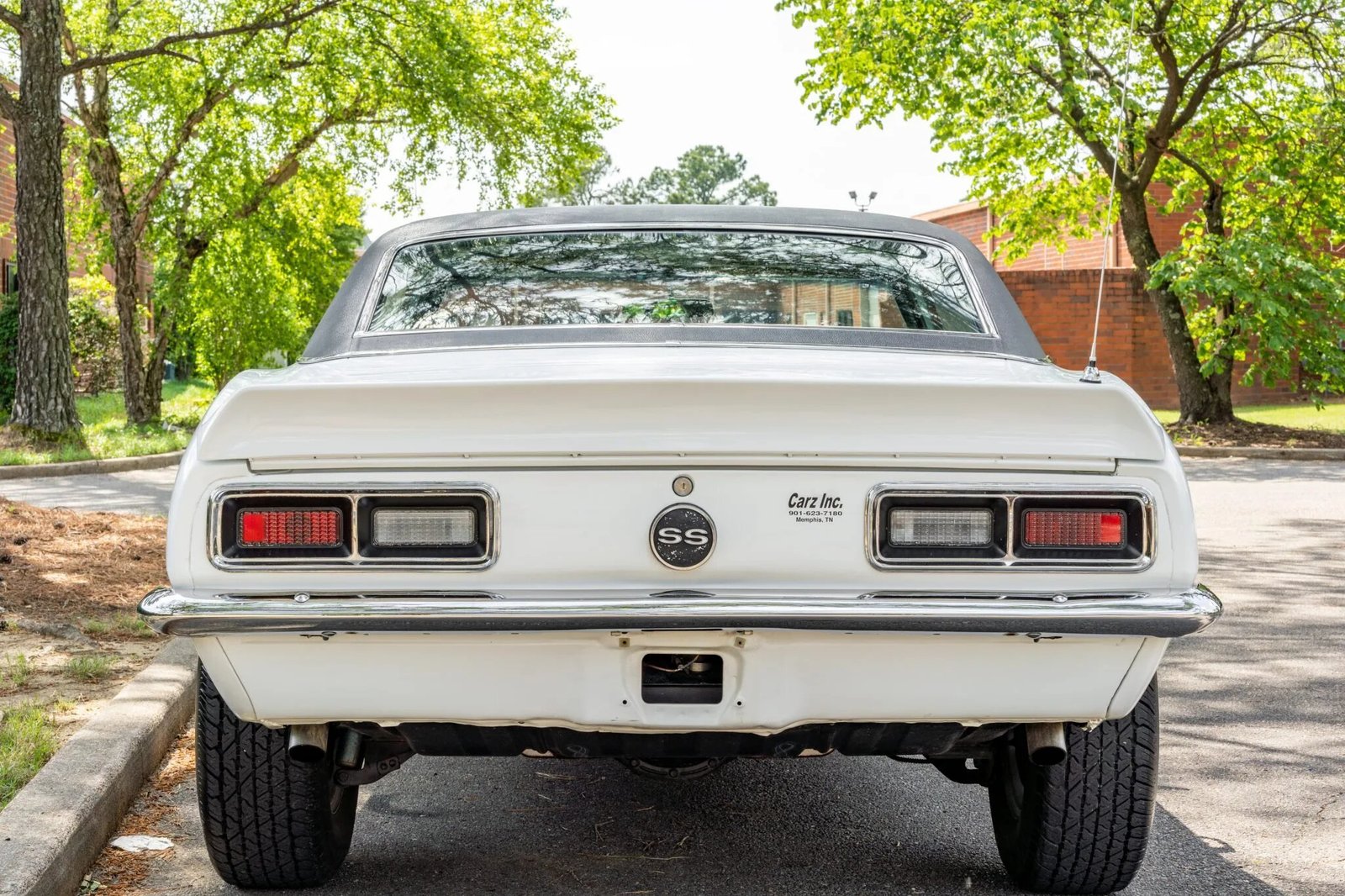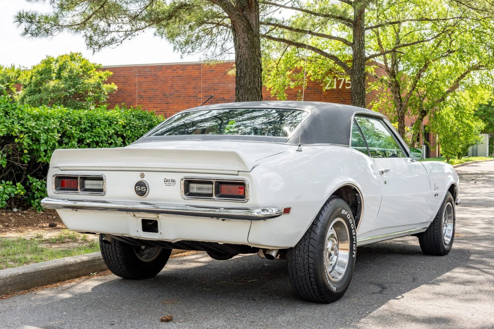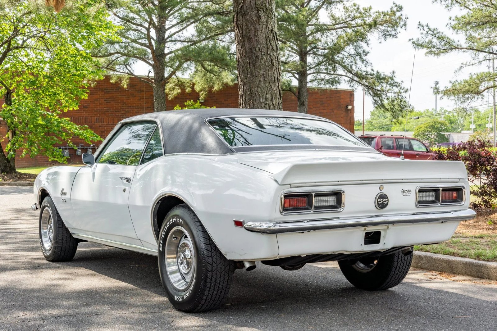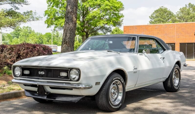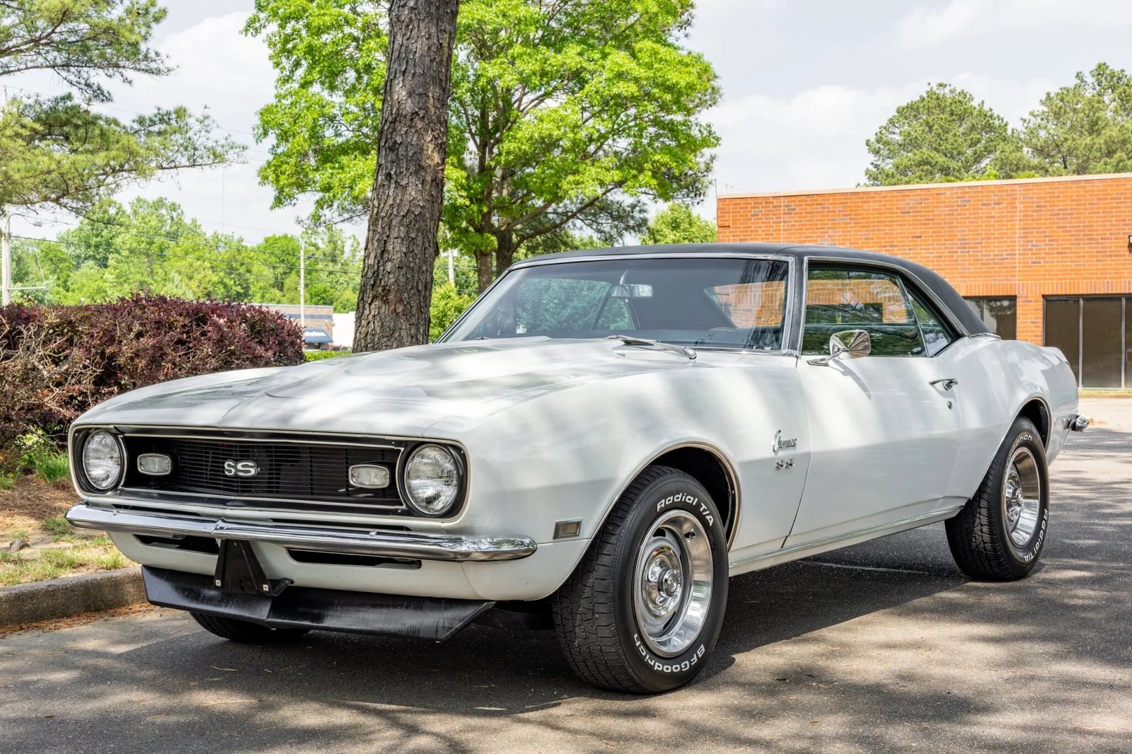 This 1968 Chevrolet Camaro is finished in white over blue and powered by a 327ci V8 paired with a three-speed automatic transmission.