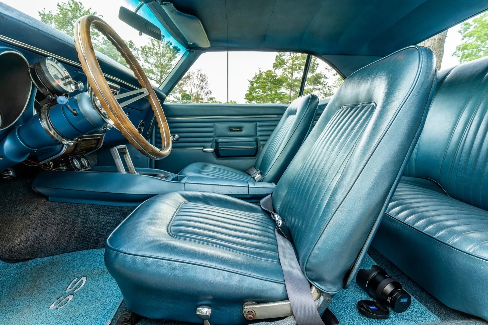 The front bucket and rear bench seats are trimmed in blue vinyl and are accompanied by a matching dashboard, headliner, door panels, and carpets.