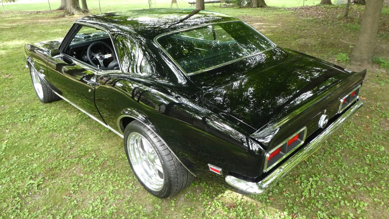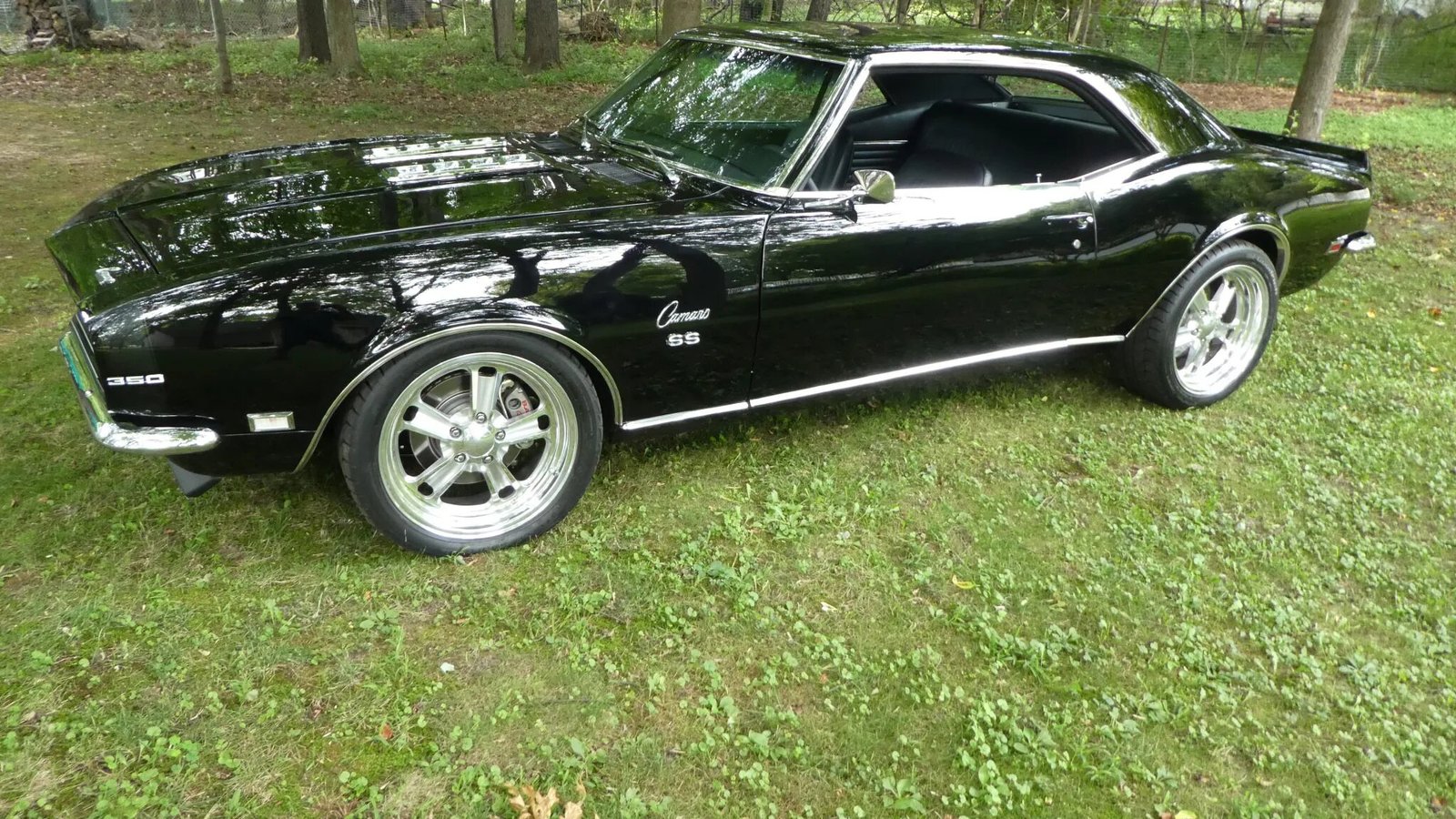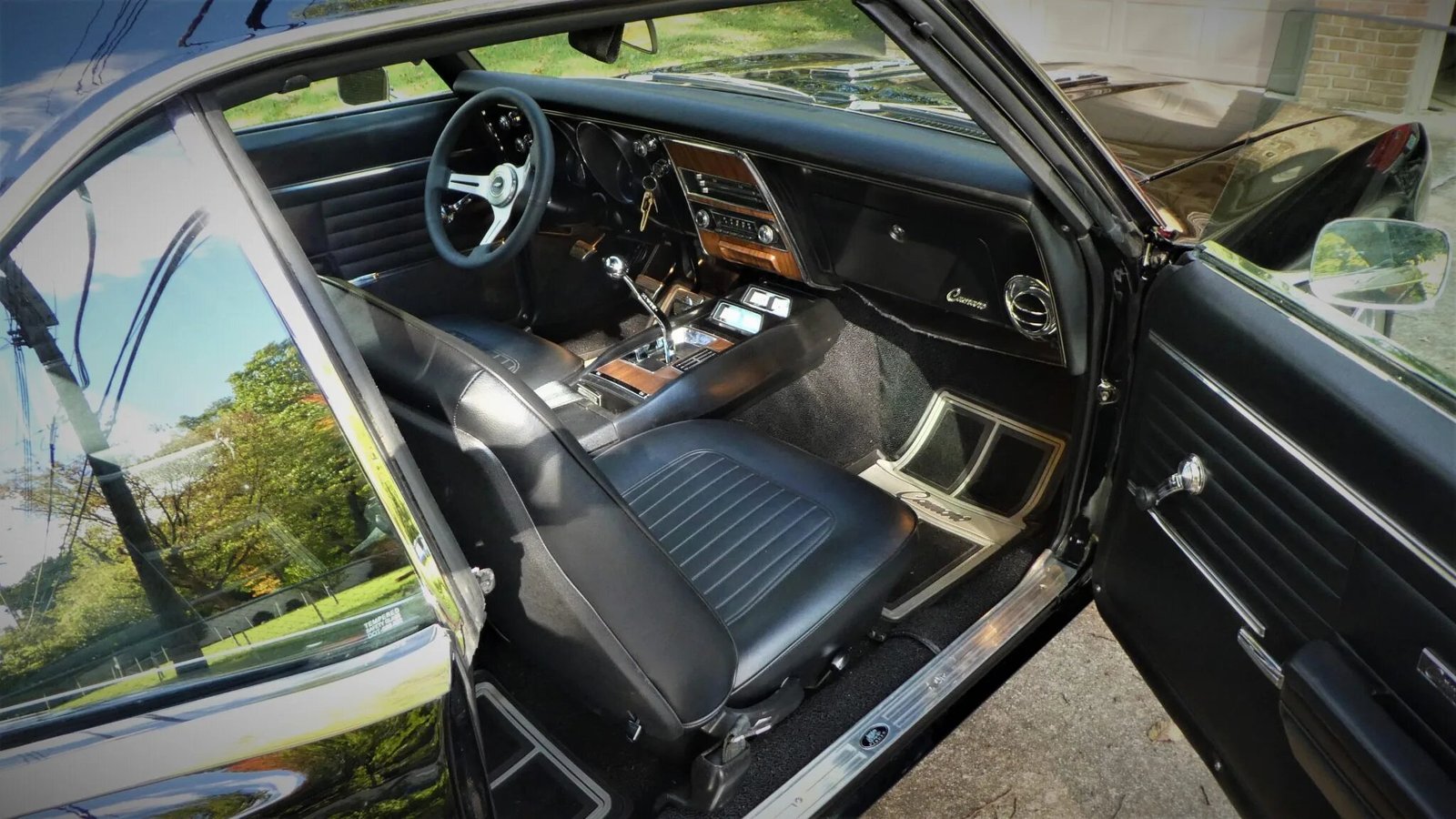 Woodgrain trim adorns the dashboard and center console, and additional features include lap belts for the front seats, courtesy lights, rubber Camaro-branded floor mats, a glovebox, and a push-button AM/FM radio.