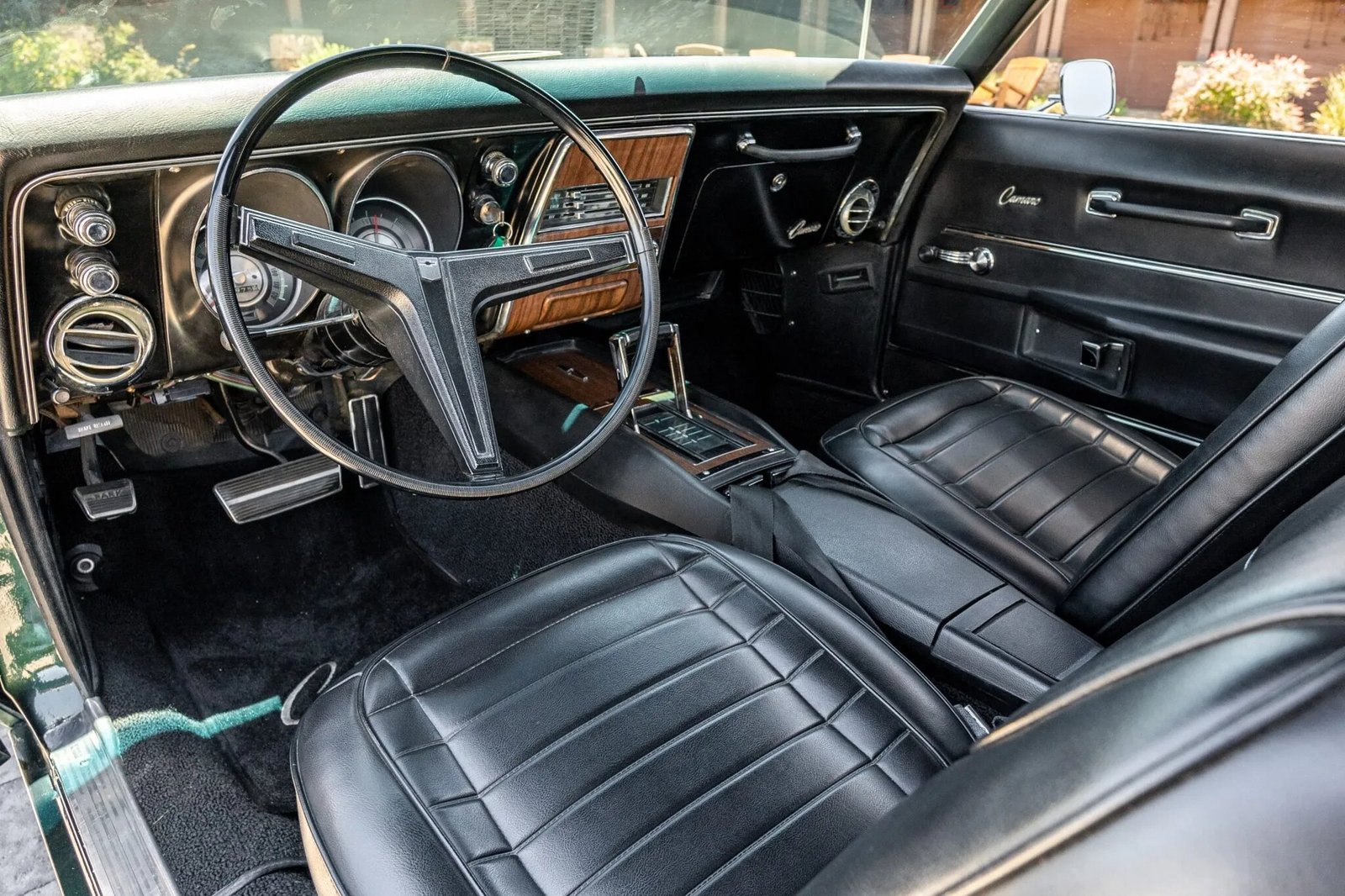 Equipment includes a center console, woodgrain trim accents, a horseshoe-style shifter, a passenger grab-handle, Camaro-branded floor mats, lap belts for all occupants, and a retro-style digital stereo.