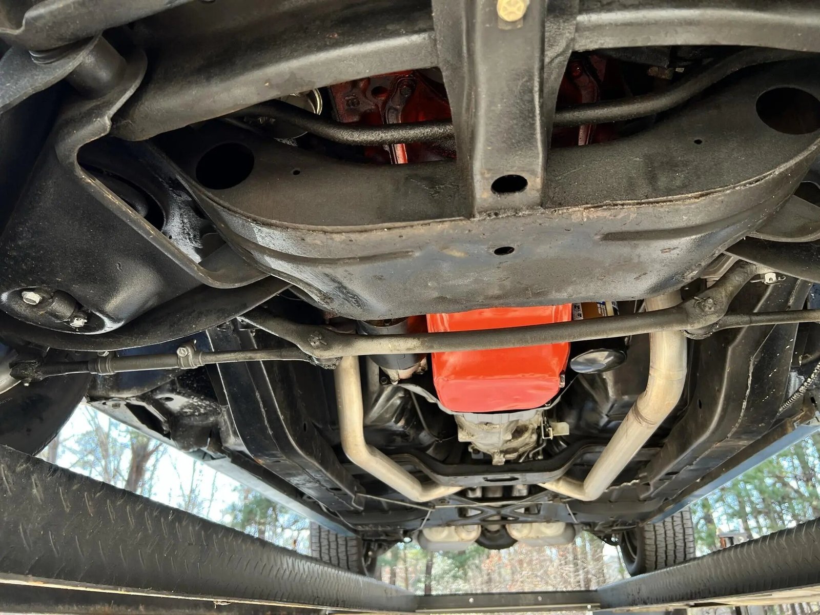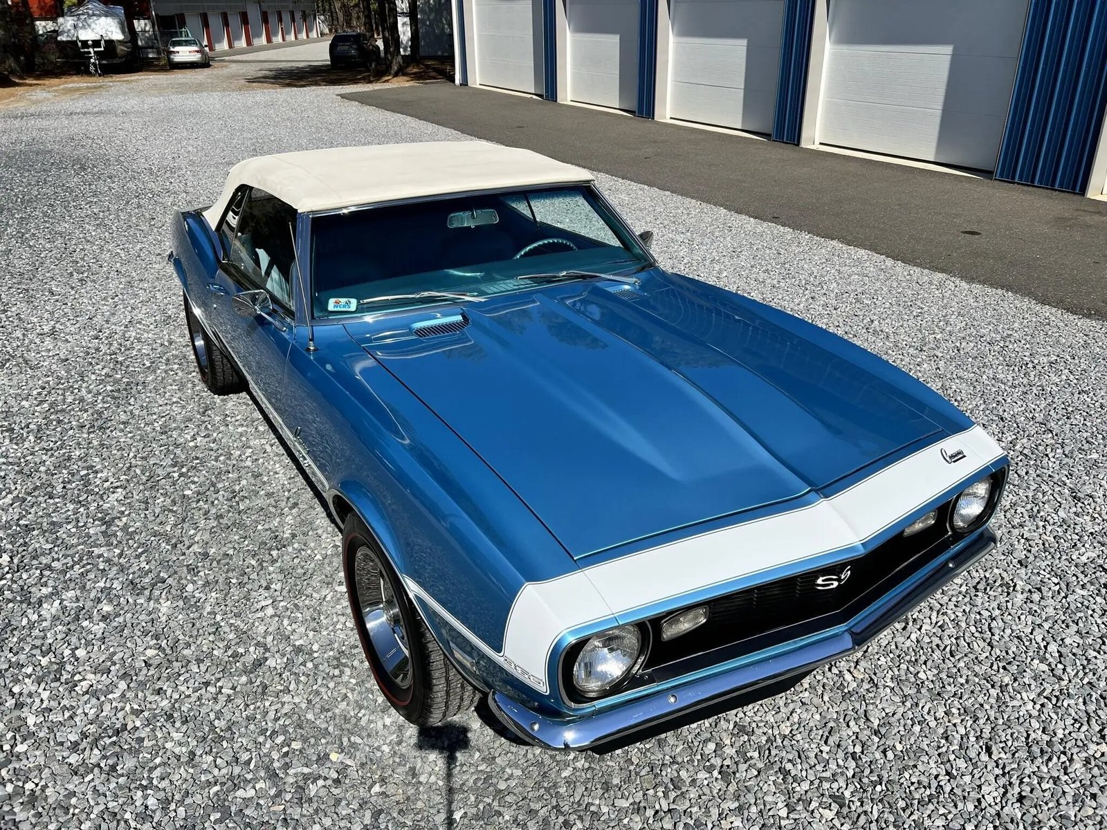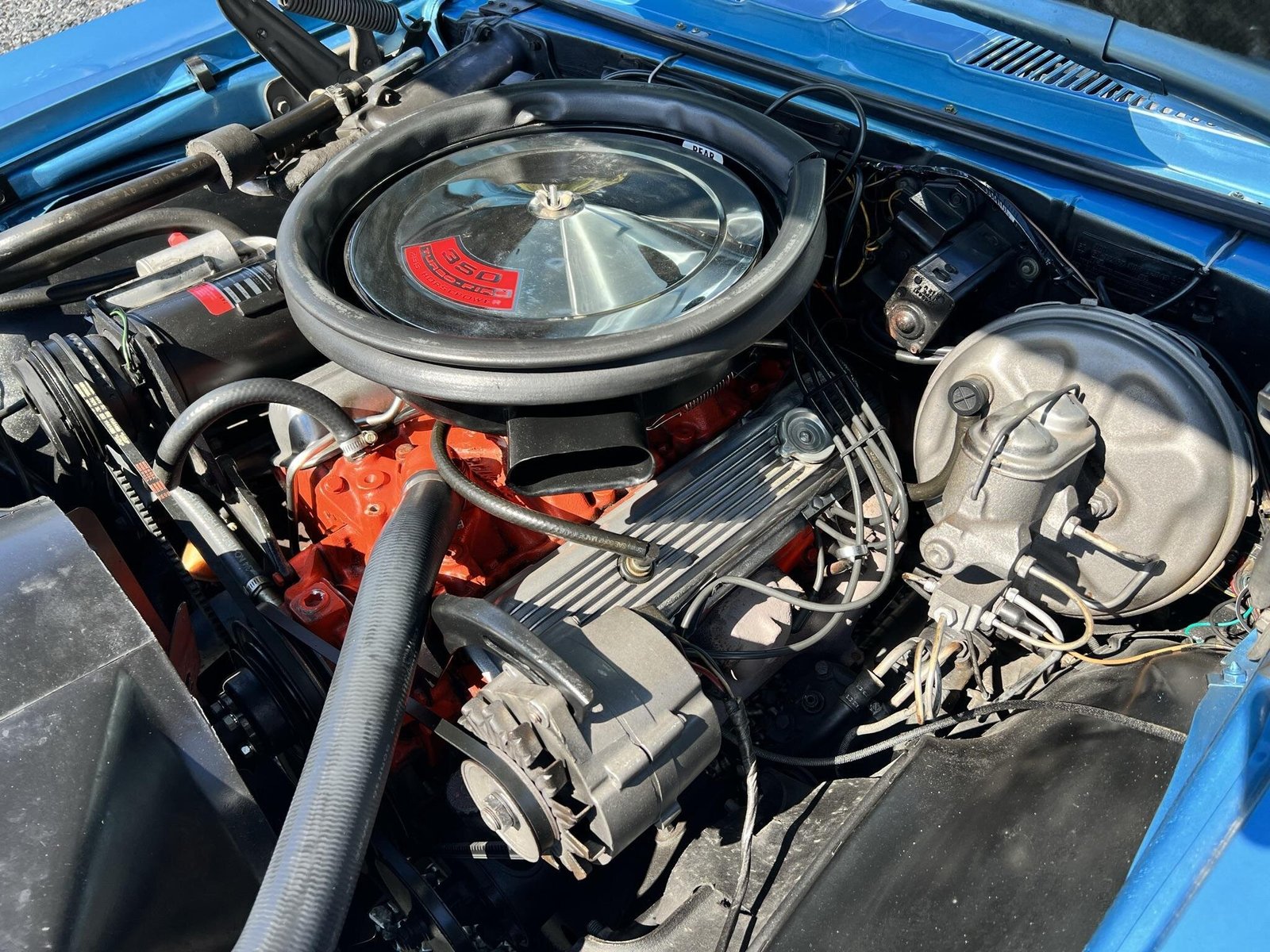 Finished from factory in Grotto Blue, the body have been repainted, exterior features include white “hockey stick” stripes, a white soft top, a cowl-induction hood, and a black front spoiler, as well as chrome windshield trim, front and rear bumpers, side mirrors, SS badges, and windshield wipers.