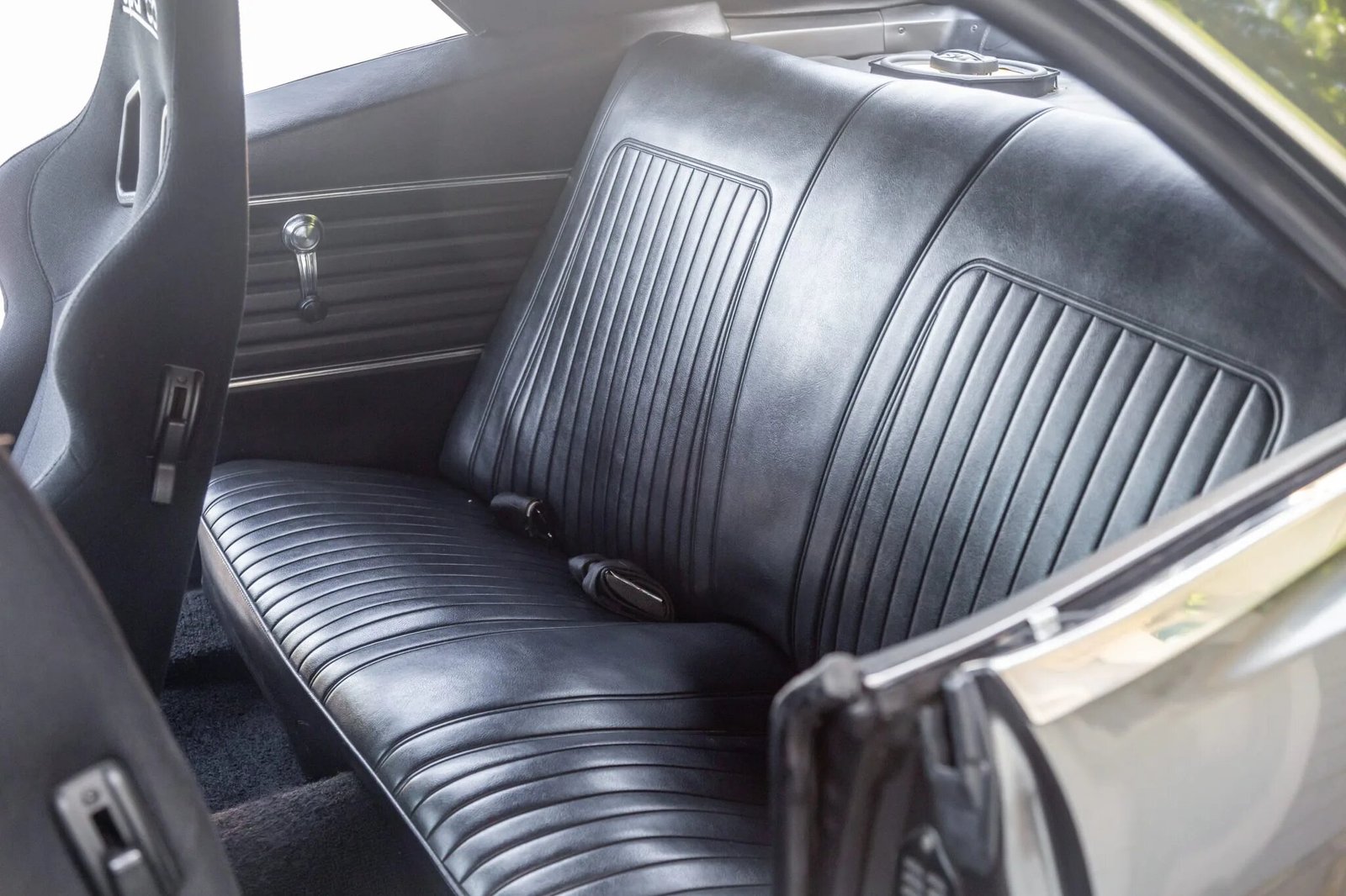 Dynamat sound deadening has been installed below the carpeting, and equipment includes power steering, woodgrain trim, a floor-mounted shifter, and an Alpine Bluetooth stereo linked to JL Audio speakers.