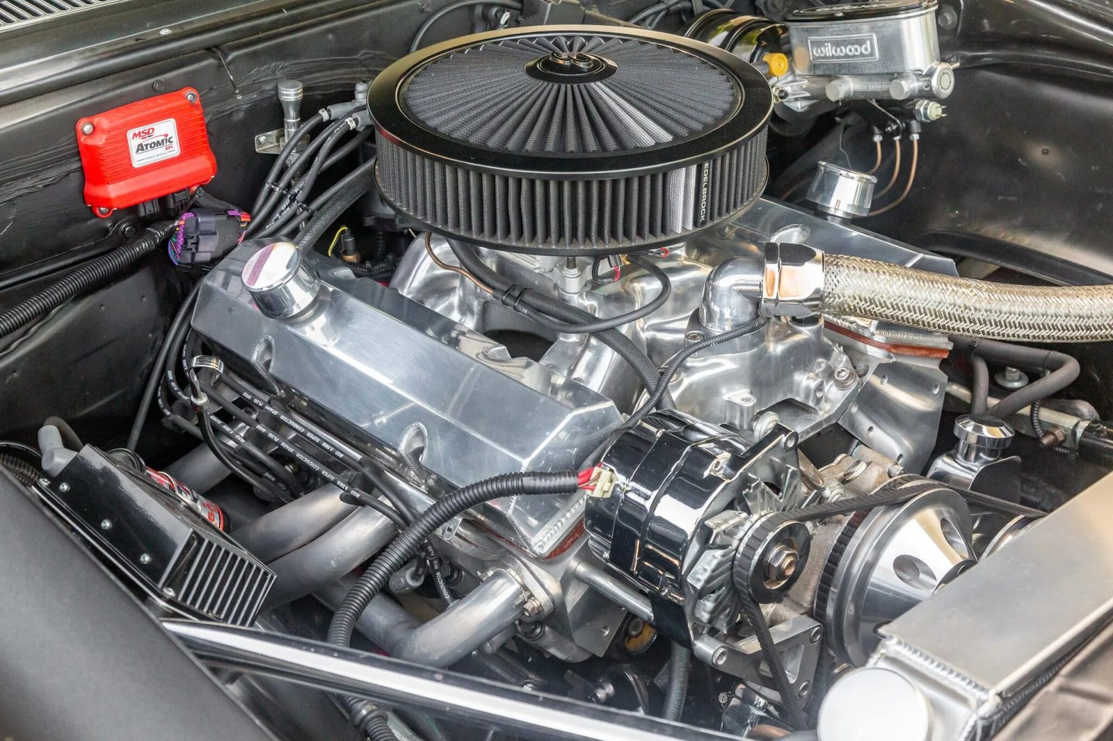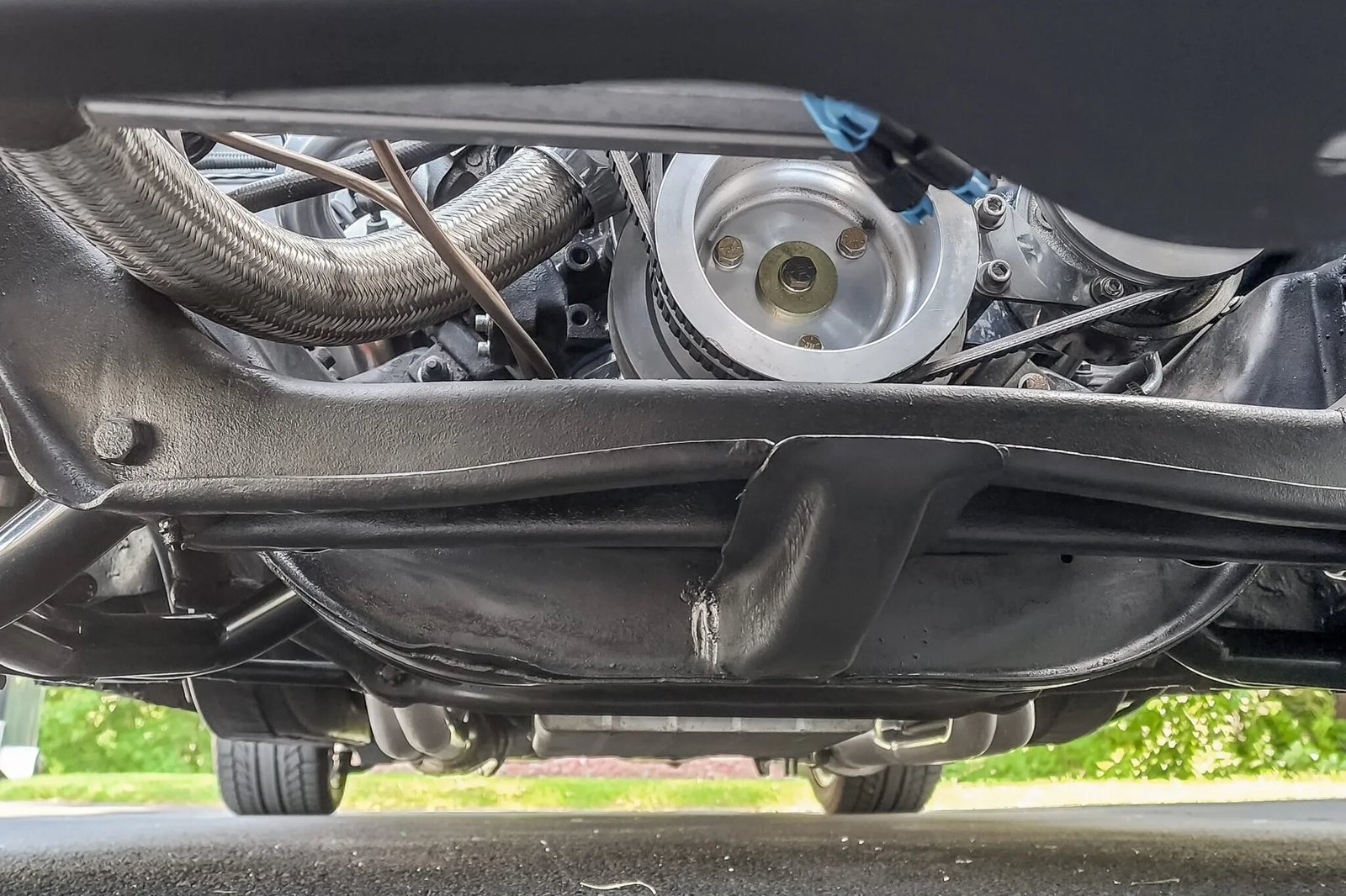The replacement 383ci V8 was installed and is equipped with aluminum cylinder heads, MSD fuel injection and ignition systems, an aluminum radiator with electric cooling fans, a Flowmaster exhaust system, and a Painless Performance wiring harness.